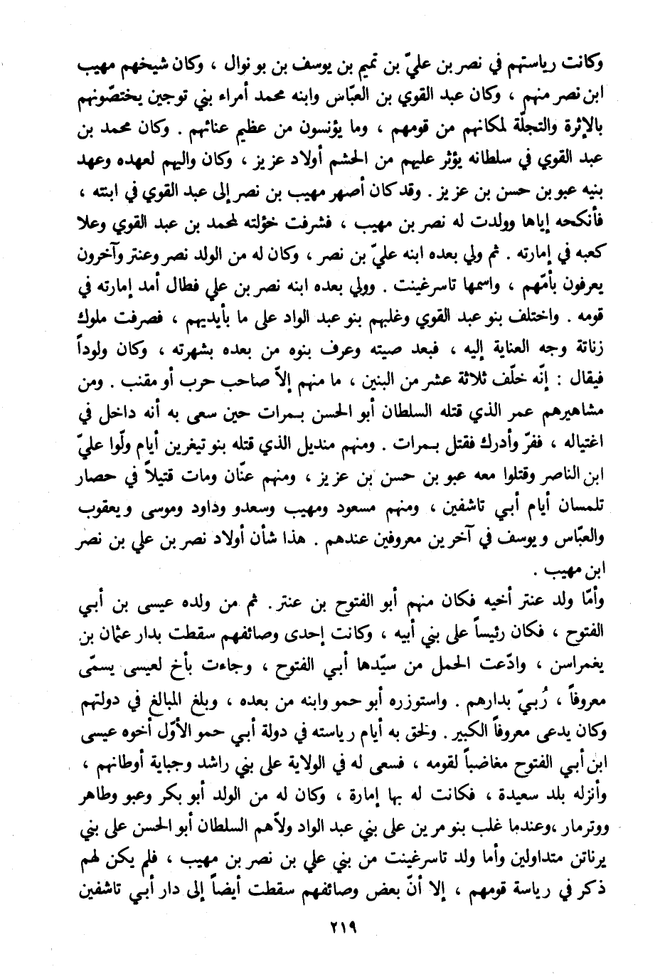 وكانت رياستهم في نصر بن عليّ بن تميم بن يوسف بن بونوال، وكان شيخهم مهيب ابن نصر منهم، وكان عبد القوي بن العبّاس وابنه محمد أمراء بني توجين يختصّونهم بالإثرة والتجلّة لمكانهم من قومهم، وما يؤنسون من عظيم عنائهم. وكان محمد بن عبد القوي في سلطانه يؤثر عليهم من الحشم أولاد عزيز، وكان واليهم لعهده وعهد بنيه عبو بن حسن بن عزيز. وقد كان أصهر مهيب بن نصر إلى عبد القوي في ابنته، فأنكحه إياها وولدت له نصر بن مهيب، فشرفت خؤولته لمحمد بن عبد القوي وعلا كعبه في إمارته. ثم ولي بعده ابنه عليّ بن نصر، وكان له من الولد نصر وعنتر وآخرون يعرفون بأمّهم، واسمها تاسرغينت. وولي بعده ابنه نصر بن علي فطال أمد إمارته في قومه. واختلف بنو عبد القوي وغلبهم بنو عبد الواد على ما بأيديهم، فصرفت ملوك زناتة وجه العناية إليه، فبعد صيته وعرف بنوه من بعده بشهرته، وكان ولودا فيقال: إنّه خلّف ثلاثة عشر من البنين، ما منهم إلّا صاحب حرب أو مقنب. ومن مشاهيرهم عمر الّذي قتله السلطان أبو الحسن بمرات حين سعى به أنه داخل في اغتياله، ففرّ وأدرك فقتل بمرات. ومنهم منديل الّذي قتله بنو تيغرين أيام ولّوا عليّ ابن الناصر وقتلوا معه عبو بن حسن بن عزيز، ومنهم عنّان ومات قتيلا في حصار تلمسان أيام أبي تاشفين، ومنهم مسعود ومهيب وسعدو وداود وموسى ويعقوب والعبّاس ويوسف في آخرين معروفين عندهم. هذا شأن أولاد نصر بن علي بن نصر ابن مهيب.