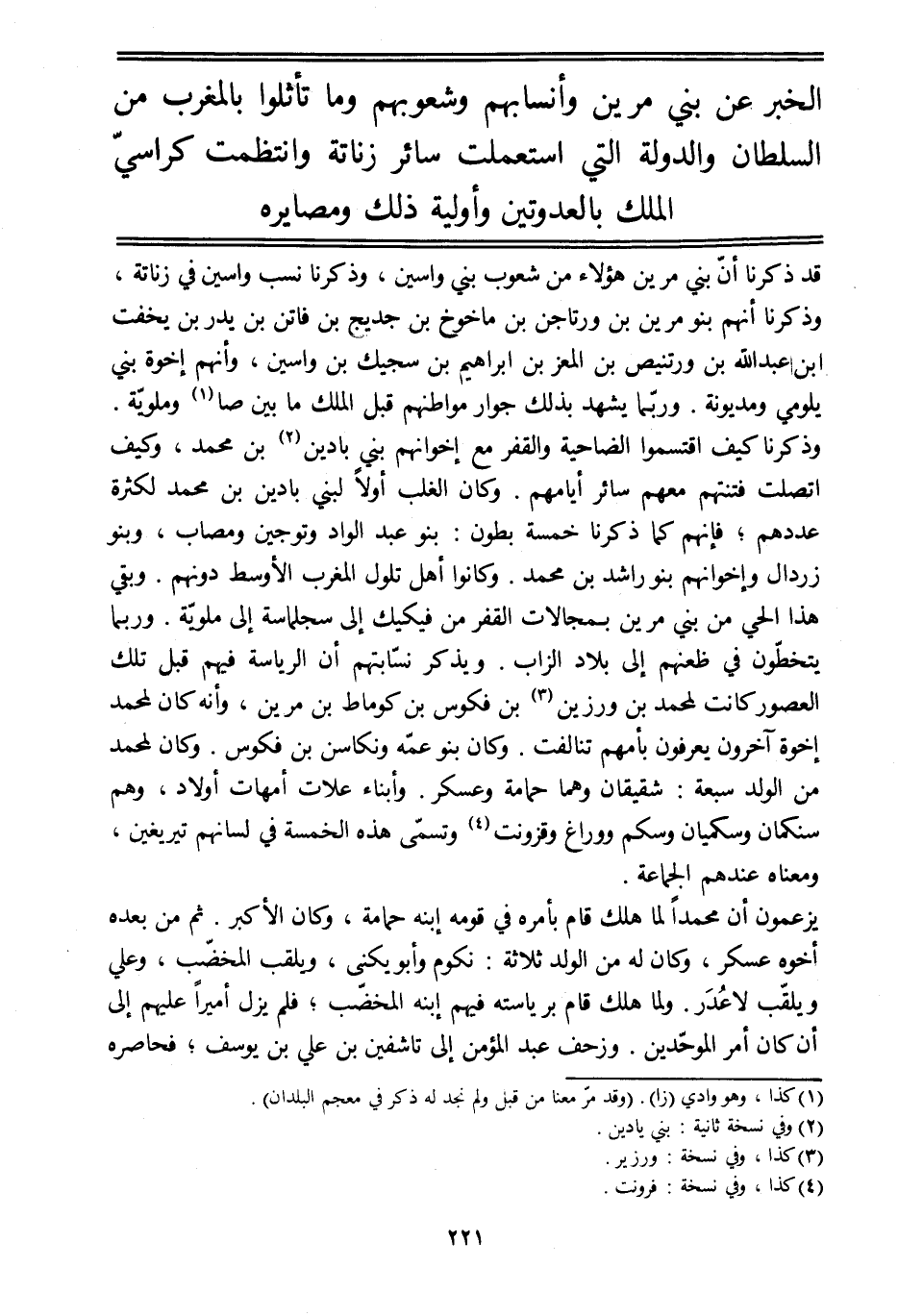 الخبر عن بني مرين وأنسابهم وشعوبهم وما تأثلوا بالمغرب من السلطان والدولة التي استعملت سائر زناتة وانتظمت كراسيّ الملك بالعدوتين وأولية ذلك ومصايره