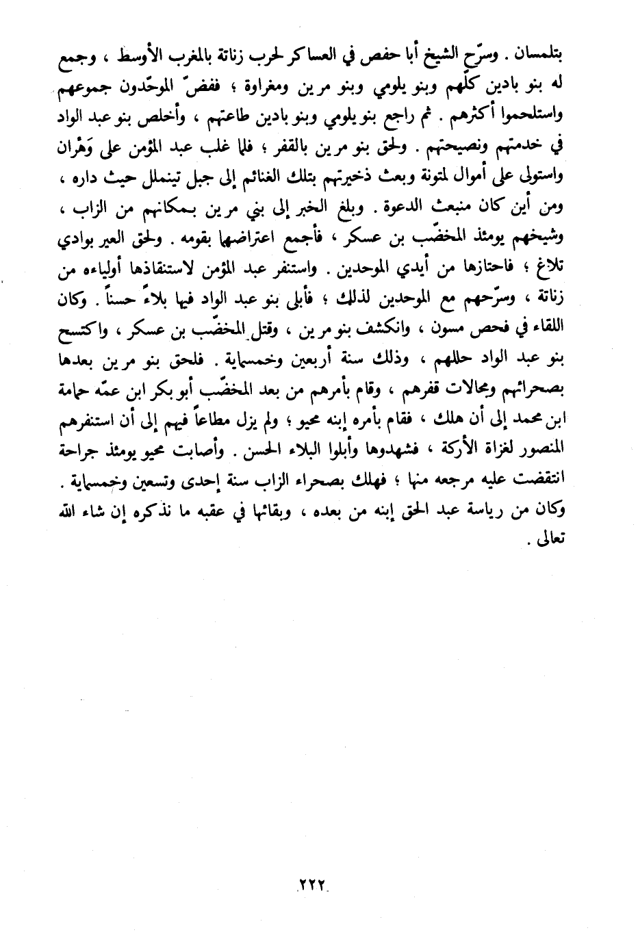 بتلمسان. وسرّح الشيخ أبا حفص في العساكر لحرب زناتة بالمغرب الأوسط، وجمع له بنو بادين كلّهم وبنو يلومي وبنو مرين ومغراوة، ففضّ الموحّدون جموعهم واستلحموا أكثرهم. ثم راجع بنو يلومي وبنو بادين طاعتهم، وأخلص بنو عبد الواد في خدمتهم ونصيحتهم. ولحق بنو مرين بالقفر، فلما غلب عبد المؤمن على وهران واستولى على أموال لمتونة وبعث ذخيرتهم بتلك الغنائم إلى جبل تين ملّل حيث داره، ومن أين كان منبعث الدعوة. وبلغ الخبر إلى بني مرين بمكانهم من الزاب، وشيخهم يومئذ المخضّب بن عسكر، فأجمع اعتراضهما بقومه. ولحق العير بوادي تلاغ، فاحتازها من أيدي الموحدين. واستنفر عبد المؤمن لاستنقاذها أولياءه من زناتة، وسرّحهم مع الموحدين لذلك، فأبلى بنو عبد الواد فيها بلاء حسنا. وكان اللقاء في فحص مسون، وانكشف بنو مرين، وقتل المخضّب بن عسكر، واكتسح بنو عبد الواد حللهم، وذلك سنة أربعين وخمسمائة. فلحق بنو مرين بعدها بصحرائهم ومجالات قفرهم، وقام بأمرهم من بعد المخضّب أبو بكر ابن عمّه حمامة ابن محمد إلى أن هلك، فقام بأمره ابنه محيو، ولم يزل مطاعا فيهم إلى أن استنفرهم المنصور لغزاة الأركة، فشهدوها وأبلوا البلاء الحسن. وأصابت محيو يومئذ جراحة انتقضت عليه مرجعه منها، فهلك بصحراء الزاب سنة إحدى وتسعين وخمسمائة.