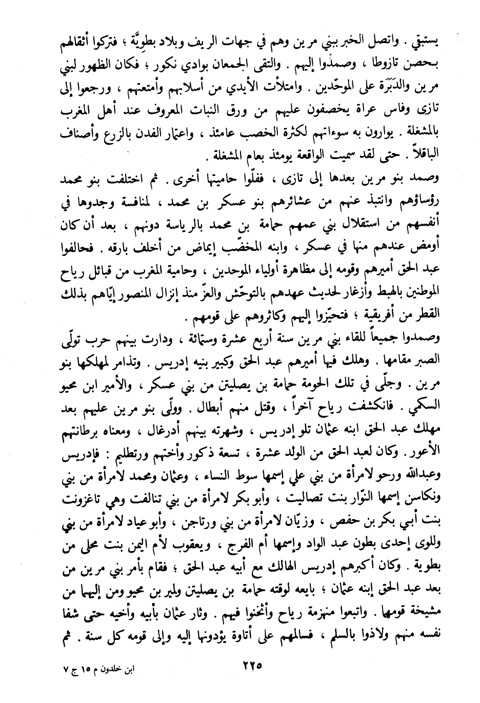 يستبقي. واتصل الخبر ببني مرين وهم في جهات الريف وبلاد بطويّة، فتركوا أثقالهم بحصن تازوطا، وصمدوا إليهم. والتقى الجمعان بوادي نكور، فكان الظهور لبني مرين والدبرة على الموحّدين. وامتلأت الأيدي من أسلابهم وأمتعتهم، ورجعوا إلى تازى وفاس عراة يخصفون عليهم من ورق النبات المعروف عند أهل المغرب بالمشغلة. يوارون به سوءاتهم لكثرة الخصب عامئذ، واعتمار الفدن بالزرع وأصناف الباقلّاء. حتى لقد سميت الواقعة يومئذ بعام المشغلة.