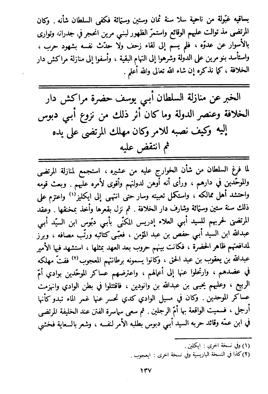 لما فرغ السلطان من شأن الخوارج عليه من عشيرة، استجمع لمنازلة المرتضى والموحّدين في دارهم، ورأى أنه أوهن لدولتهم وأقوى لأمره عليهم. وبعث قومه واحتشد أهل ممالكه، واستكمل تعبيته وسار حتى انتهى إلى ايكليز [1] واعتزم على ذلك سنة ستين وستمائة وشارف دار الخلافة. ثم نزل بقعرها وأخذ بمخنقها. وعقد المرتضى لحربهم للسيد أبي العلاء إدريس المكنّى بأبي دبّوس ابن السيّد أبي عبد الله ابن السيد أبي حفص بن عبد المؤمن، فعبّى كتائبه ورتّب مصافه، وبرز لمدافعتهم ظاهر الحضرة، فكانت بينهم حروب بعد العهد بمثلها، استشهد فيها الأمير عبد الله بن يعقوب بن عبد الحق، وكانوا يسمونه برطانتهم المعجوب [2] ففتّ مهلكه في عضدهم، وارتحلوا عنها إلى أعمالهم، واعترضهم عساكر الموحّدين بوادي أمّ الربيع، وعليهم يحيى بن عبد الله بن وانودين، فاقتتلوا في بطن الوادي وانهزمت عساكر الموحدين. وكان في مسيل الوادي كدي تحسر عنها غمر الماء تبدو كأنها أرجل، فسميت الواقعة بها أمّ الرجلين. ثم سعى سماسرة الفتن عند الخليفة المرتضى في ابن عمّه وقائد حربه السيّد أبي دبوس بطلبه الأمر لنفسه، وشعر بالسعاية فخشي