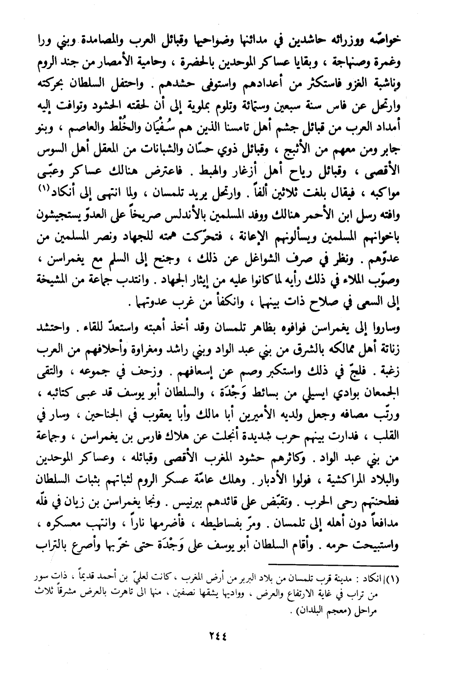 [1] انكاد: مدينة قرب تلمسان من بلاد البربر من أرض المغرب، كانت لعليّ بن أحمد قديما، ذات سور من تراب في غاية الارتفاع والعرض، وواديها يشقها نصفين، منها الى تاهرت بالعرض مشرقا ثلاث مراحل (معجم البلدان) .