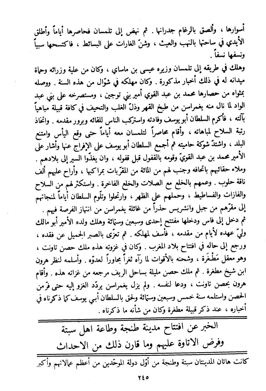 الخبر عن افتتاح مدينة طنجة وطاعة أهل سبتة وفرض الاتاوة عليهم وما قارن ذلك من الاحداث