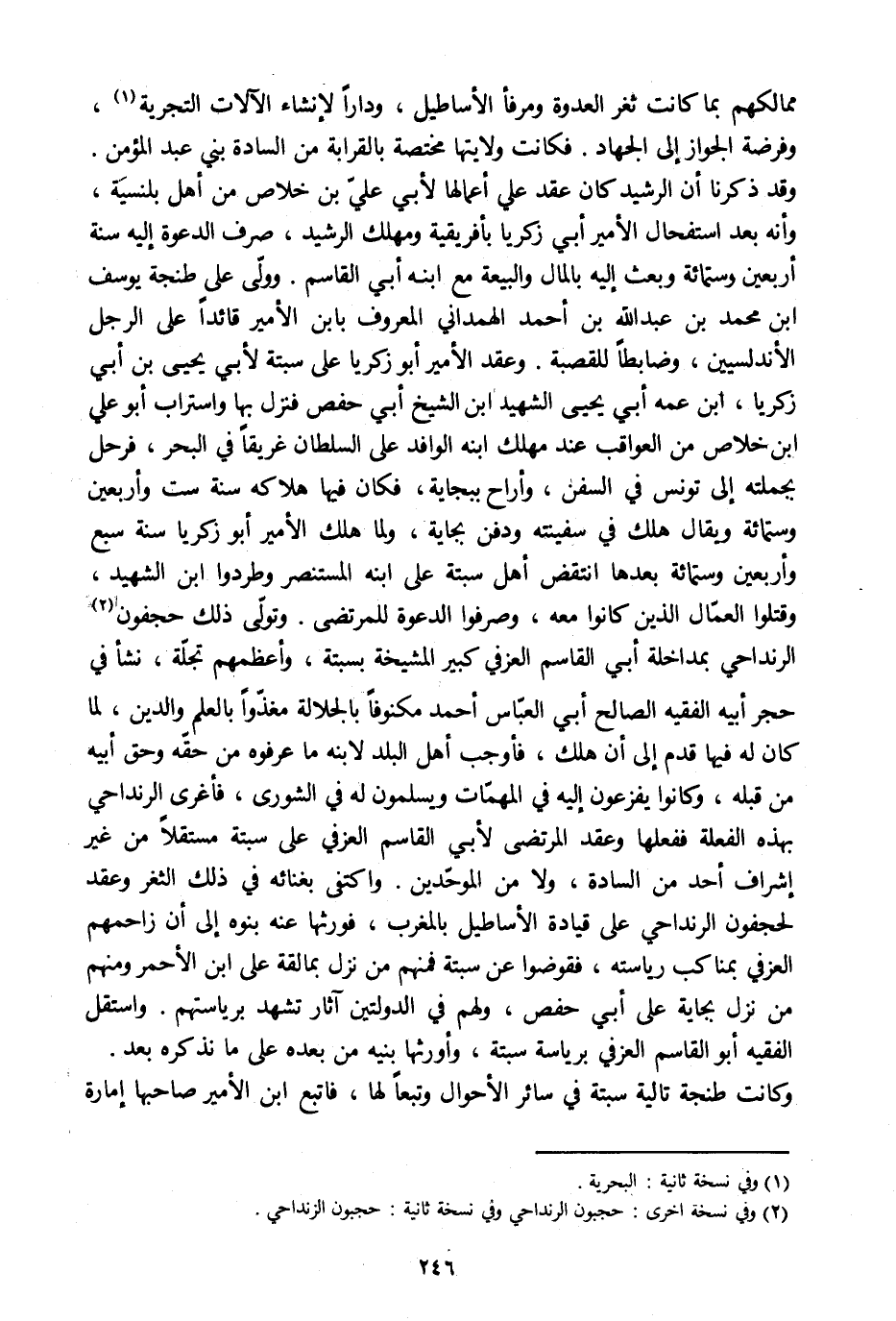 وقد ذكرنا أن الرشيد كان عقد علي أعمالها لأبي عليّ بن خلاص من أهل بلنسية، وأنه بعد استفحال الأمير أبي زكريا بإفريقية ومهلك الرشيد، صرف الدعوة إليه سنة أربعين وستمائة وبعث إليه بالمال والبيعة مع ابنه أبي القاسم. وولّى على طنجة يوسف ابن محمد بن عبد الله بن أحمد الهمدانيّ المعروف بابن الأمير قائدا على الرجل الأندلسيين، وضابطا للقصبة. وعقد الأمير أبو زكريا على سبتة لأبي يحيى بن أبي زكريا، ابن عمه أبي يحيى الشهيد ابن الشيخ أبي حفص فنزل بها واستراب أبو علي ابن خلاص من العواقب عند مهلك ابنه الوافد على السلطان غريقا في البحر، فرحل بجملته إلى تونس في السفن، وأراح ببجاية، فكان فيها هلاكه سنة ست وأربعين وستمائة ويقال هلك في سفينته ودفن بجاية، ولما هلك الأمير أبو زكريا سنة سبع وأربعين وستمائة بعدها انتقض أهل سبتة على ابنه المستنصر وطردوا ابن الشهيد، وقتلوا العمّال الذين كانوا معه، وصرفوا الدعوة للمرتضى. وتولّى ذلك حجفون [2] الرنداحي بمداخلة أبي القاسم العزفي كبير المشيخة بسبتة، وأعظمهم تجلّة، نشأ في حجر أبيه الفقيه الصالح أبي العبّاس أحمد مكنوفا بالجلالة مغذّوا بالعلم والدين، لما كان له فيها قدم إلى أن هلك، فأوجب أهل البلد لابنه ما عرفوه من حقّه وحق أبيه من قبله، وكانوا يفزعون إليه في المهمّات ويسلمون له في الشورى، فأغرى الرنداحي بهذه الفعلة ففعلها وعقد المرتضى لأبي القاسم العزفي على سبتة مستقلا من غير إشراف أحد من السادة، ولا من الموحّدين. واكتفى بغنائه في ذلك الثغر وعقد لحجبون الرنداحي على قيادة الأساطيل بالمغرب، فورثها عنه بنوه إلى أن زاحمهم العزفي بمناكب رياسته، فقوضوا عن سبتة فمنهم من نزل بمالقة على ابن الأحمر ومنهم من نزل بجاية على أبي حفص، ولهم في الدولتين آثار تشهد برياستهم. واستقل الفقيه أبو القاسم العزفي برياسة سبتة، وأورثها بنيه من بعده على ما نذكره بعد.