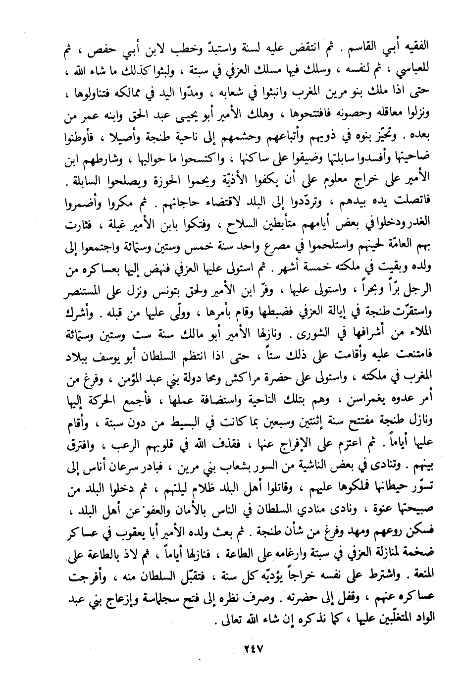 فاتصلت يده بيدهم، وتردّدوا إلى البلد لاقتضاء حاجاتهم. ثم مكروا وأضمروا الغدر ودخلوا في بعض أيامهم متأبطين السلاح، وفتكوا بابن الأمير غيلة، فثارت بهم العامّة لحينهم واستلحموا في مصرع واحد سنة خمس وستين وستمائة واجتمعوا إلى ولده وبقيت في ملكته خمسة أشهر. ثم استولى عليها العزفي فنهض إليها بعساكره من الرجل برّا وبحرا، واستولى عليها، وفرّ ابن الأمير ولحق بتونس ونزل على المستنصر واستقرّت طنجة في إيالة العزفي فضبطها وقام بأمرها، وولّى عليها من قبله. وأشرك الملاء من أشرافها في الشورى. ونازلها الأمير أبو مالك سنة ست وستين وستمائة فامتنعت عليه وأقامت على ذلك ستا، حتى إذا انتظم السلطان أبو يوسف ببلاد المغرب في ملكته، واستولى على حضرة مراكش ومحا دولة بني عبد المؤمن، وفرغ من أمر عدوه يغمراسن، وهم بتلك الناحية واستضافة عملها، فأجمع الحركة إليها ونازل طنجة مفتتح سنة اثنتين وسبعين بما كانت في البسيط من دون سبتة، وأقام عليها أياما. ثم اعتزم على الإفراج عنها، فقذف الله في قلوبهم الرعب، وافترق بينهم. وتنادى في بعض الناشية من السور بشعاب بني مرين، فبادر سرعان أناس إلى تسوّر حيطانها فملكوها عليهم، وقاتلوا أهل البلد ظلام ليلتهم، ثم دخلوا البلد من صبيحتها عنوة، ونادى منادي السلطان في الناس بالأمان والعفو عن أهل البلد، فسكن روعهم ومهد وفرغ من شأن طنجة. ثم بعث ولده الأمير أبا يعقوب في عساكر ضخمة لمنازلة العزفي في سبتة وارغامه على الطاعة، فنازلها أياما، ثم لاذ بالطاعة على المنعة. واشترط على نفسه خراجا يؤديه كل سنة، فتقبّل السلطان منه، وأفرجت عساكره عنهم، وقفل إلى حضرته. وصرف نظره إلى فتح سجلماسة وإزعاج بني عبد الواد المتغلّبين عليها، كما نذكره إن شاء الله تعالى.