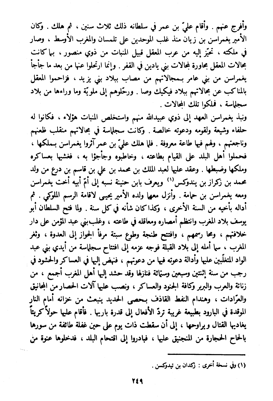 ونبذ يغمراسن العهد إلى ذوي عبيد الله منهم واستخلص المنبات هؤلاء، فكانوا له حلفاء وشيعة ولقومه ودعوته خالصة. وكانت سجلماسة في مجالاتهم منقلب ظعنهم وناجعتهم، ولهم فيها طاعة معروفة. فلما هلك عليّ بن عمر آثروا يغمراسن بملكها، فحملوا أهل البلد على القيام بطاعته، وخاطبوه وجأجئوا به، فغشيها بعساكره وملكها وضبطها. وعقد عليها لعبد الملك بن محمد بن علي بن قاسم بن درع من ولد محمد بن زكراز بن يندوكس [1] ويعرف بابن حنينة نسبه إلى أمّ أبيه أخت يغمراسن ومعه يغمراسن بن حمامة. وأنزل معهما ولده الأمير يحيى لإقامة الرسم الملوكي. ثم أداله بأخيه من السنة الأخرى، وكذا كان شأنه في كل سنة. ولما فتح السلطان أبو يوسف بلاد المغرب وانتظم أمصاره ومعاقلة في طاعته، وغلب بني عبد المؤمن على دار خلافتهم، ومحا رسمهم، وافتتح طنجة وطوع سبتة مرفأ الجواز إلى العدوة، وثغر المغرب، سما أمله إلى بلاد القبلة فوجه عزمه إلى افتتاح سجلماسة من أيدي بني عبد الواد المتغلّبين عليها وإدالة دعوته فيها من دعوتهم، فنهض إليها في العساكر والحشود في رجب من سنة اثنتين وسبعين وستمائة فنازلها وقد حشد إليها أهل المغرب أجمع، من زناتة والعرب والبربر وكافة الجنود والعساكر، ونصب عليها آلات الحصار من المجانيق والعرّادات، وهندام النفط القاذف بحصى الحديد ينبعث من خزانه أمام النار الموقدة في البارود بطبيعة غريبة تردّ الأفعال إلى قدرة باريها. فأقام عليها حولا كريتا يغاديها القتال ويراوحها، إلى أن سقطت ذات يوم على حين غفلة طائفة من سورها بإلحاح الحجارة من المنجنيق عليها، فبادروا إلى اقتحام البلد، فدخلوها عنوة من