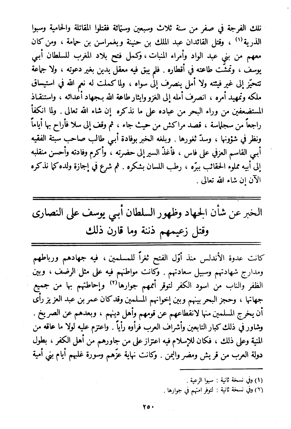 تلك الفرجة في صفر من سنة ثلاث وسبعين وستمائة فقتلوا المقاتلة والحامية وسبوا الذرية [1] ، وقتل القائدان عبد الملك بن حنينة ويغمراسن بن حمامة، ومن كان معهم من بني عبد الواد وأمراء المنبات، وكمل فتح بلاد المغرب للسلطان أبي يوسف، وتمشّت طاعته في أقطاره. فلم يبق فيه معقل يدين بغير دعوته، ولا جماعة تتحيّز إلى غير فيئته ولا أمل ينصرف إلى سواه، ولما كملت له نعم الله في استيساق ملكه وتمهيد أمره، انصرف أمله إلى الغزو وإيثار طاعة الله بجهاد أعدائه، واستنقاذ المستضعفين من وراء البحر من عباده على ما نذكره إن شاء الله تعالى. ولما انكفأ راجعا من سجلماسة، قصد مراكش من حيث جاء، ثم وقف إلى سلا فأراح بها أياما ونظر في شئونها، وسدّ ثغورها. وبلغه الخبر بوفادة أبي طالب صاحب سبتة الفقيه أبي القاسم العزفي على فاس، فأغذّ السير إلى حضرته، وأكرم وفادته وأحسن منقلبه إلى أبيه مملوء الحقائب ببرّه، رطب اللسان بشكره. ثم شرع في إجازة ولده كما نذكره الآن إن شاء الله تعالى.