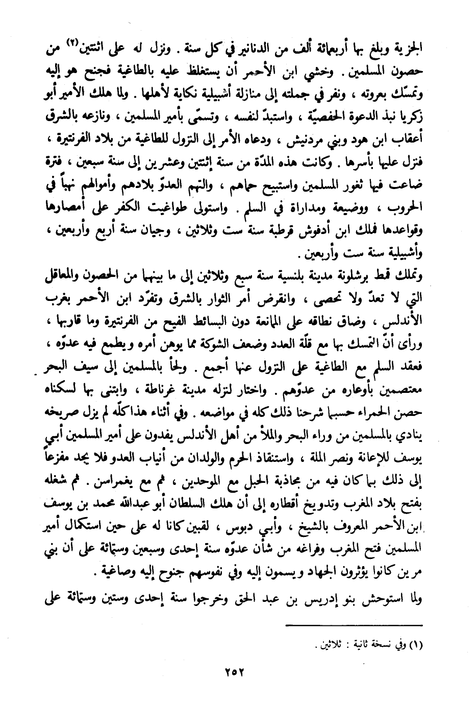 الجزية وبلغ بها أربعمائة ألف من الدنانير في كل سنة. ونزل له على اثنتين [1] من حصون المسلمين. وخشي ابن الأحمر أن يستغلظ عليه بالطاغية فجنح هو إليه وتمسّك بعروته، ونفر في جملته إلى منازلة إشبيليّة نكاية لأهلها. ولما هلك الأمير أبو زكريا نبذ الدعوة الحفصيّة، واستبدّ لنفسه، وتسمّى بأمير المسلمين، ونازعه بالشرق أعقاب ابن هود وبني مردنيش، ودعاه الأمر إلى النزول للطاغية من بلاد الفرنتيرة، فنزل عليها بأسرها. وكانت هذه المدّة من سنة اثنتين وعشرين إلى سنة سبعين، فترة ضاعت فيها ثغور المسلمين واستبيح حماهم، والتهم العدوّ بلادهم وأموالهم نهبا في الحروب، ووضيعة ومداراة في السلم. واستولى طواغيت الكفر على أمصارها وقواعدها فملك ابن أدفوش قرطبة سنة ست وثلاثين، وجيان سنة أربع وأربعين، وإشبيليّة سنة ست وأربعين.