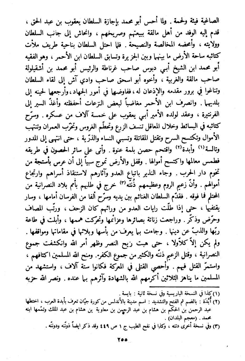الصاغية فيئة ولحمة. ولما أحس أبو محمد بإجازة السلطان يعقوب بن عبد الحق، قدم إليه الوفد من أهل مالقة ببيعتهم وصريخهم، وانحاش إلى جانب السلطان وولايته، وأمحضه المخالصة والنصيحة. فلما احتل السلطان بناحية طريف ملأت كتائبه ساحة الأرض ما بينهما وبين الجزيرة وتسابق السلطان ابن الأحمر، وهو الفقيه أبو محمد ابن الشيخ أبي دبوس صاحب غرناطة والرئيس أبو محمد بن أشقيلولة صاحب مالقة والغربية، وأخوه أبو إسحاق صاحب وادي آش إلى لقاء السلطان وتناغوا في برور مقدمه والإذعان له، ففاوضهما في أمور الجهاد، وأرجعهما لحينه إلى بلديهما. وانصرف ابن الأحمر مغاضبا لبعض النزعات أحفظته وأغذّ السير إلى الفرنتيرة، وعقد لولده الأمير أبي يعقوب على خمسة آلاف من عسكره. وسرّح كتائبه في البسائط وخلال المعاقل تنسف الزرع وتحطّم الغروس وتخرّب العمران وتنتهب الأموال وتكتسح السرح وتقتل المقاتلة وتسبي النساء والذرّية، حتى انتهى إلى المدور وتالسة [1] وأبدة [2] واقتحم حصن بلمة عنوة. وأتى على سائر الحصون في طريقه فطمس معالمها واكتسح أموالها. وقفل والأرض تموج سبيا إلى أن عرس بأستجة من تخوم دار الحرب. وجاء النذير باتباع العدو وآثارهم لاستنقاذ أسراهم وارتجاع أموالهم. وأنّ زعيم الروم وعظيمهم ذنّته [3] خرج في طلبهم بأمم بلاد النصرانية من المحتلم فما فوقه. فقدّم السلطان الغنائم بين يديه وسرّح ألفا من الفرسان أمامها، وسار يقتفيها، حتى إذا طلّت رايات العدو من ورائهم كان الزحف، ورتّب المصاف وحرّض وذكّر. وراجعت زناتة بصائرها وعزائمها وتحرّكت هممها، وأبلت في طاعة ربّها والذبّ عن دينها. وجاءت بما يعرف من بأسها وبلائها في مقاماتها ومواقفها.