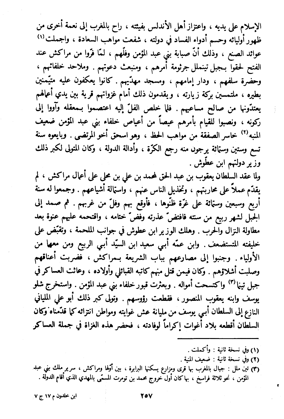 [3] تين ملل: جبال بالمغرب بها قرى ومزارع يسكنها البرابرة، بين أوّلها ومراكش، سرير ملك بني عبد المؤمن، نحو ثلاثة فراسخ، بها كان أول خروج محمد بن تومرت المسمّى بالمهديّ الّذي أقام الدولة.