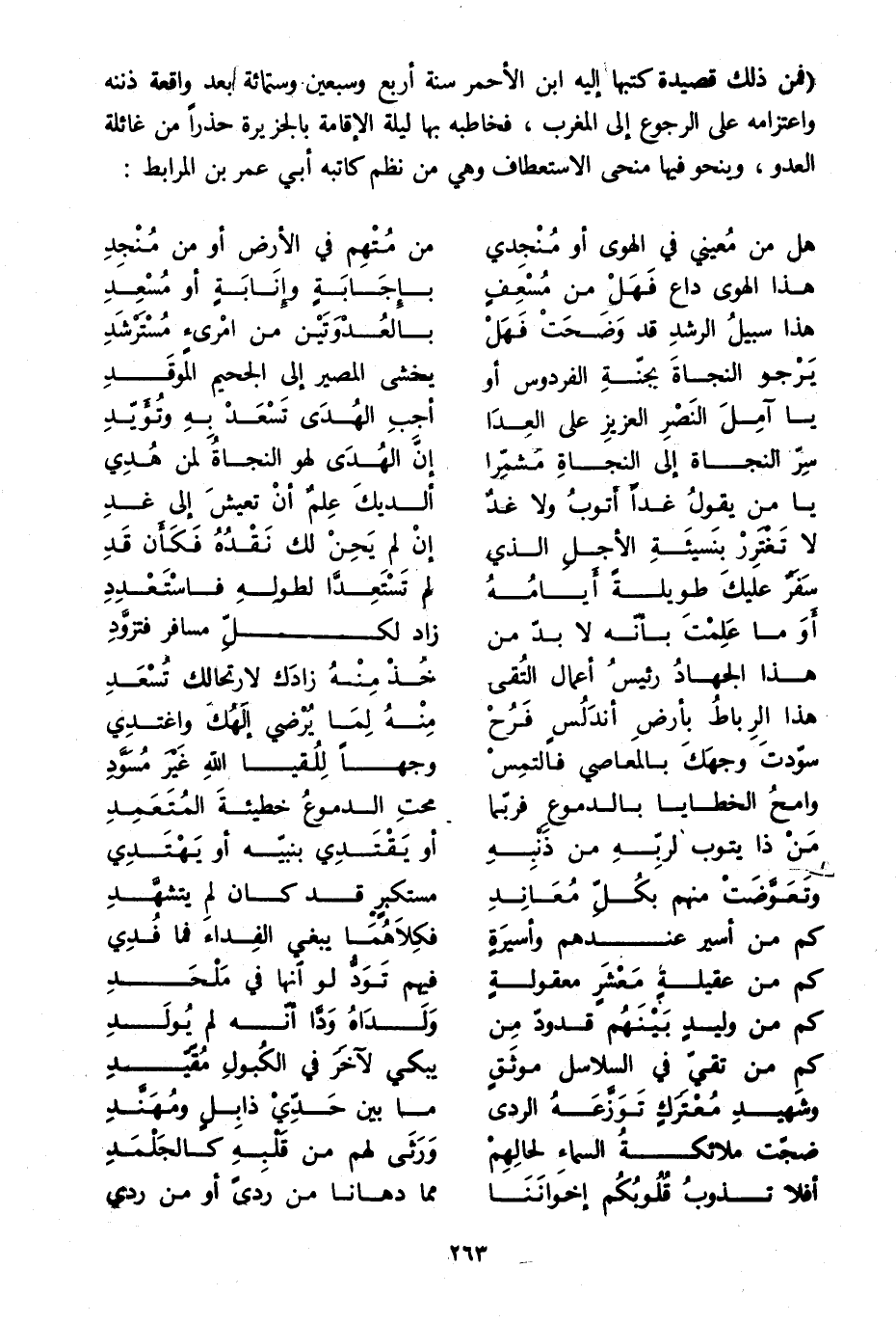 (فمن ذلك قصيدة كتبها إليه ابن الأحمر سنة أربع وسبعين وستمائة بعد واقعة ذنّنه واعتزامه على الرجوع إلى المغرب، فخاطبه بها ليلة الإقامة بالجزيرة حذرا من غائلة العدو، وينحو فيها منحى الاستعطاف وهي من نظم كاتبه أبي عمر بن المرابط: