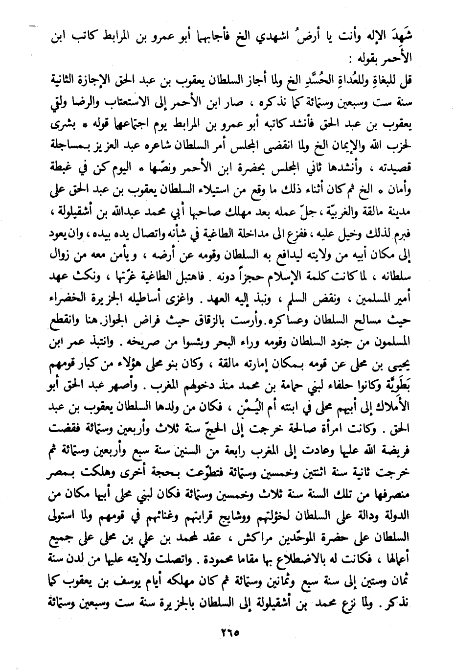 قل للبغاة وللعداة الحسّد إلخ ولما أجاز السلطان يعقوب بن عبد الحق الإجازة الثانية سنة ست وسبعين وستمائة كما نذكره، صار ابن الأحمر إلى الاستعتاب والرضا ولقي يعقوب بن عبد الحق فأنشد كاتبه أبو عمرو بن المرابط يوم اجتماعهما قوله بشرى لحزب الله والإيمان إلخ ولما انقضى المجلس أمر السلطان شاعره عبد العزيز بمساجلة قصيدته، وأنشدها ثاني المجلس بحضرة ابن الأحمر ونصّها اليوم كن في غبطة وأمان إلخ ثم كان أثناء ذلك ما وقع من استيلاء السلطان يعقوب بن عبد الحق على مدينة مالقة والغربيّة، جلّ عمله بعد مهلك صاحبها أبي محمد عبد الله بن أشقيلولة، فبرم لذلك وخيل عليه، ففزع الى مداخلة الطاغية في شأنه واتصال يده بيده، وان يعود إلى مكان أبيه من ولايته ليدافع به السلطان وقومه عن أرضه، ويأمن معه من زوال سلطانه، لما كانت كلمة الإسلام حجزا دونه. فاهتبل الطاغية غرّتها، ونكث عهد أمير المسلمين، ونقض السلم، ونبذ إليه العهد. واغزى أساطيله الجزيرة الخضراء حيث مسالح السلطان وعساكره. وأرست بالزقاق حيث فراض الجواز. هنا وانقطع المسلمون من جنود السلطان وقومه وراء البحر ويئسوا من صريخه. وانتبذ عمر ابن يحيى بن محلى عن قومه بمكان إمارته مالقة، وكان بنو محلى هؤلاء من كبار قومهم بطويّة وكانوا حلفاء لبني حمامة بن محمد منذ دخولهم المغرب. وأصهر عبد الحق أبو الأملاك إلى أبيهم محلى في ابنته أم اليمن، فكان من ولدها السلطان يعقوب بن عبد الحق. وكانت امرأة صالحة خرجت إلى الحجّ سنة ثلاث وأربعين وستمائة فقضت فريضة الله عليها وعادت إلى المغرب رابعة من السنين سنة سبع وأربعين وستمائة ثم خرجت ثانية سنة اثنتين وخمسين وستمائة فتطوّعت بحجة أخرى وهلكت بمصر منصرفها من تلك السنة سنة ثلاث وخمسين وستمائة فكان لبني محلى أبيها مكان من الدولة ودالة على السلطان لخؤولتهم ووشايج قرابتهم وغنائهم في قومهم ولما استولى السلطان على حضرة الموحّدين مراكش، عقد لمحمد بن علي بن محلى على جميع أعمالها، فكانت له بالاضطلاع بها مقاما محمودة. واتصلت ولايته عليها من لدن سنة ثمان وستين إلى سنة سبع وثمانين وستمائة ثم كان مهلكه أيام يوسف بن يعقوب كما نذكر. ولما نزع محمد بن أشقيلولة إلى السلطان بالجزيرة سنة ست وسبعين وستمائة