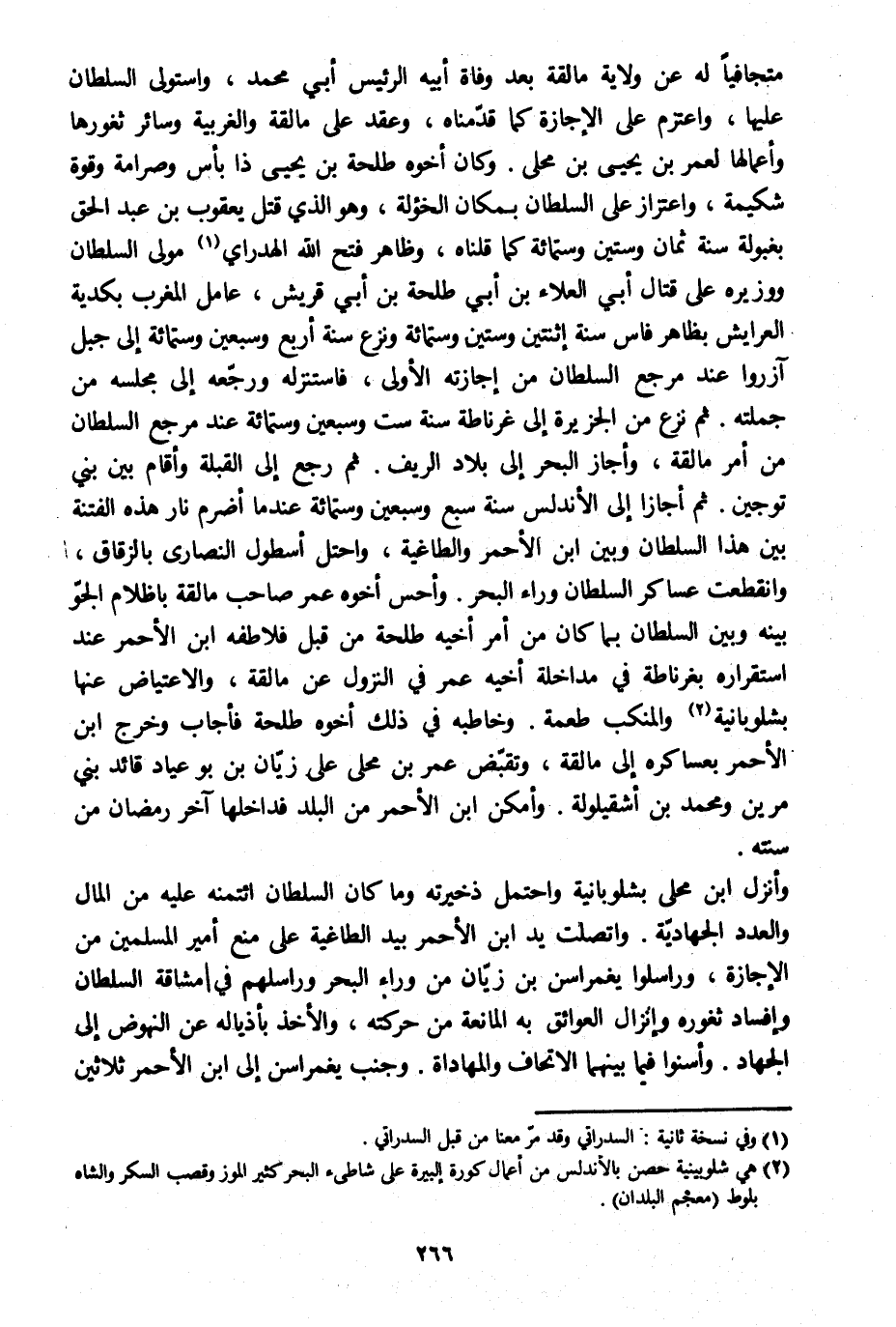 متجافيا له عن ولاية مالقة بعد وفاة أبيه الرئيس أبي محمد، واستولى السلطان عليها، واعتزم على الإجازة كما قدّمناه، وعقد على مالقة والغربية وسائر ثغورها وأعمالها لعمر بن يحيى بن محلى. وكان أخوه طلحة بن يحيى ذا بأس وصرامة وقوة شكيمة، واعتزاز على السلطان بمكان الخئولة، وهو الّذي قتل يعقوب بن عبد الحق بغبولة سنة ثمان وستين وستمائة كما قلناه، وظاهر فتح الله الهدراي [1] مولى السلطان ووزيره على قتال أبي العلاء بن أبي طلحة بن أبي قريش، عامل المغرب بكدية العرايش بظاهر فاس سنة اثنتين وستين وستمائة ونزع سنة أربع وسبعين وستمائة إلى جبل آزروا عند مرجع السلطان من إجازته الأولى، فاستنزله ورجّعه إلى مجلسه من جملته. ثم نزع من الجزيرة إلى غرناطة سنة ست وسبعين وستمائة عند مرجع السلطان من أمر مالقة، وأجاز البحر إلى بلاد الريف. ثم رجع إلى القبلة وأقام بين بني توجين. ثم أجازا إلى الأندلس سنة سبع وسبعين وستمائة عند ما أضرم نار هذه الفتنة بين هذا السلطان وبين ابن الأحمر والطاغية، واحتل أسطول النصارى بالزقاق، وانقطعت عساكر السلطان وراء البحر. وأحس أخوه عمر صاحب مالقة باظلام الجوّ بينه وبين السلطان بما كان من أمر أخيه طلحة من قبل فلاطفه ابن الأحمر عند استقراره بغرناطة في مداخلة أخيه عمر في النزول عن مالقة، والاعتياض عنها بشلوبانية [2] والمنكب طعمة. وخاطبه في ذلك أخوه طلحة فأجاب وخرج ابن الأحمر بعساكره إلى مالقة، وتقبّض عمر بن محلى على زيّان بن بو عياد قائد بني مرين ومحمد بن أشقيلولة. وأمكن ابن الأحمر من البلد فداخلها آخر رمضان من سنته.
