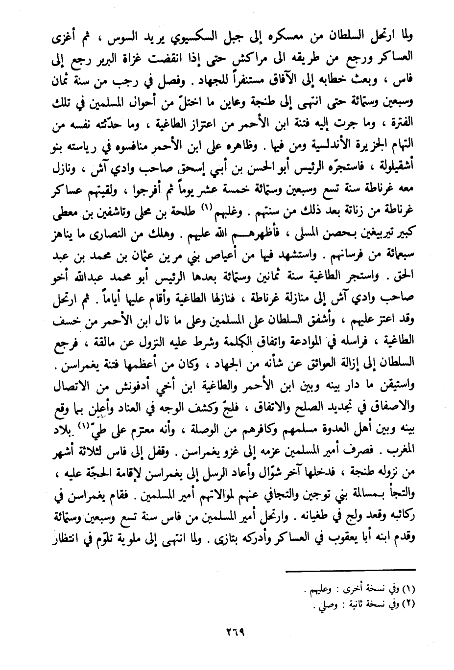 ولما ارتحل السلطان من معسكره إلى جبل السكسيوي يريد السوس، ثم أغزى العساكر ورجع من طريقه الى مراكش حتى إذا انقضت غزاة البربر رجع إلى فاس، وبعث خطابه إلى الآفاق مستنفرا للجهاد. وفصل في رجب من سنة ثمان وسبعين وستمائة حتى انتهى إلى طنجة وعاين ما اختلّ من أحوال المسلمين في تلك الفترة، وما جرت إليه فتنة ابن الأحمر من اعتزاز الطاغية، وما حدّثته نفسه من التهام الجزيرة الأندلسية ومن فيها. وظاهره على ابن الأحمر منافسوه في رياسته بنو أشقيلولة، فاستجرّه الرئيس أبو الحسن بن أبي إسحاق صاحب وادي آش، ونازل معه غرناطة سنة تسع وسبعين وستمائة خمسة عشر يوما ثم أفرجوا، ولقيتهم عساكر غرناطة من زناتة بعد ذلك من سنتهم. وغلبهم [1] طلحة بن محلى وتاشفين بن معطي كبير تيربيغين بحصن المسلى، فأظهرهم الله عليهم. وهلك من النصارى ما يناهز سبعمائة من فرسانهم. واستشهد فيها من أعياص بني مرين عثمان بن محمد بن عبد الحق. واستجر الطاغية سنة ثمانين وستمائة بعدها الرئيس أبو محمد عبد الله أخو صاحب وادي آش إلى منازلة غرناطة، فنازلها الطاغية وأقام عليها أياما. ثم ارتحل وقد اعتز عليهم، وأشفق السلطان على المسلمين وعلى ما نال ابن الأحمر من خسف الطاغية، فراسله في الموادعة واتفاق الكلمة وشرط عليه النزول عن مالقة، فرجع السلطان إلى إزالة العوائق عن شأنه من الجهاد، وكان من أعظمها فتنة يغمراسن.
