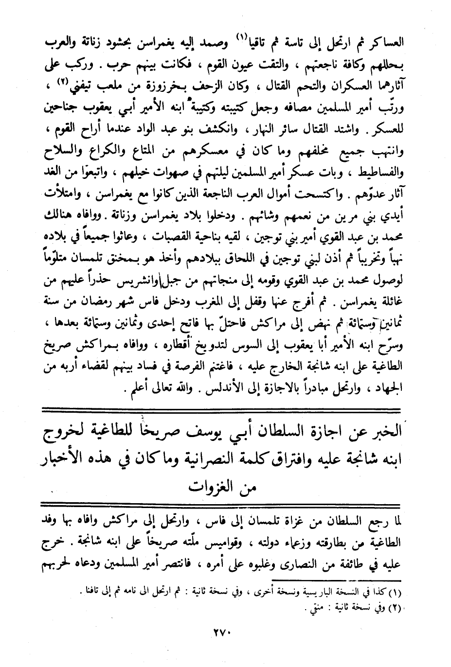 العساكر ثم ارتحل إلى تاسة ثم تاقيا [1] وصمد إليه يغمراسن بحشود زناتة والعرب بحللهم وكافة ناجعتهم، والتقت عيون القوم، فكانت بينهم حرب. وركب على آثارهما العسكران والتحم القتال، وكان الزحف بخرزوزة من ملعب تيفني [2] ، ورتّب أمير المسلمين مصافه وجعل كتيبته وكتيبة ابنه الأمير أبي يعقوب جناحين للعسكر. واشتد القتال سائر النهار، وانكشف بنو عبد الواد عند ما أراح القوم، وانتهب جميع مخلفهم وما كان في معسكرهم من المتاع والكراع والسلاح والفساطيط، وبات عسكر أمير المسلمين ليلتهم في صهوات خيلهم، واتبعوا من الغد آثار عدوّهم. واكتسحت أموال العرب الناجعة الذين كانوا مع يغمراسن، وامتلأت أيدي بني مرين من نعمهم وشائهم. ودخلوا بلاد يغمراسن وزناتة. ووافاه هنالك محمد بن عبد القوي أمير بني توجين، لقيه بناحية القصبات، وعاثوا جميعا في بلاده نهبا وتخريبا ثم أذن لبني توجين في اللحاق ببلادهم وأخذ هو بمخنق تلمسان متلوّما لوصول محمد بن عبد القوي وقومه إلى منجاتهم من جبل ونشريس حذرا عليهم من غائلة يغمراسن. ثم أفرج عنها وقفل إلى المغرب ودخل فاس شهر رمضان من سنة ثمانين وستمائة ثم نهض إلى مراكش فاحتلّ بها فاتح إحدى وثمانين وستمائة بعدها، وسرّح ابنه الأمير أبا يعقوب إلى السوس لتدويخ أقطاره، ووافاه بمراكش صريخ الطاغية على ابنه شانجة الخارج عليه، فاغتنم الفرصة في فساد بينهم لقضاء أربه من الجهاد، وارتحل مبادرا بالإجازة إلى الأندلس. والله تعالى أعلم.