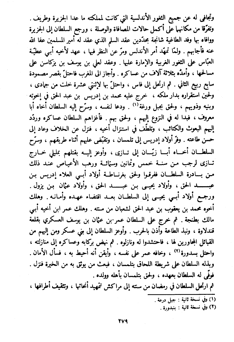 وتفرّقا من مكانهما على أكمل حالات المصافاة والوصلة، ورجع السلطان إلى الجزيرة ووافاه بها وفد الطاغية شانجة مجدّدين عقد السلم الّذي عقد له أمير المسلمين عفا الله عنه فأجابهم. ولمّا تمهّد أمر الأندلس ومرّ عن النظر فيها، عهد لأخيه أبي عطيّة العبّاس على الثغور الغربية والإمارة عليها. وعقد لعلي بن يوسف بن يزكاسن على مسالحها، وأمدّه بثلاثة آلاف من عساكره. وأجاز إلى المغرب فاحتلّ بقصر مصمودة سابع ربيع الثاني. ثم ارتحل إلى فاس، واحتلّ بها لاثنتي عشرة خلت من جمادى، ولحين استقراره بدار ملكه، خرج عليه محمد بن إدريس بن عبد الحق في إخوته وبنيه وذويهم، ولحق بجبل ورغة [1] . ودعا لنفسه، وسرّح إليه السلطان أخاه أبا معروف، فبدا له في النزوع إليهم، ولحق بهم. فأغزاهم السلطان عساكره وردّد إليهم البعوث والكتائب، وتلطّف في استنزال أخيه، فنزل عن الخلاف وعاد إلى حسن طاعته. وفرّ أولاد إدريس إلى تلمسان، وتقبّض عليهم أثناء طريقهم، وسرّح السلطان أخاه أبا زيّان إلى تازى، وأوعز إليه بقتلهم بمليلي خارج تازى لرجب من سنة خمس وثمانين وستمائة ورهب الأعياص عند ذلك من بادرة السلطان ففرقوا ولحق بغرناطة أولاد أبي العلاء إدريس بن عبد الحق، وأولاد يحيى بن عبد الحق، وأولاد عثمان بن يزول.