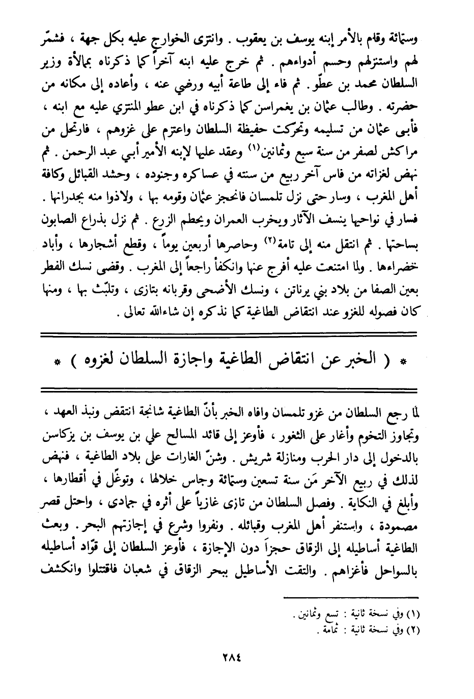وستمائة وقام بالأمر ابنه يوسف بن يعقوب. وانتزى الخوارج عليه بكل جهة، فشمّر لهم واستنزلهم وحسم أدواءهم. ثم خرج عليه ابنه آخرا كما ذكرناه بممالأة وزير السلطان محمد بن عطّو. ثم فاء إلى طاعة أبيه ورضي عنه، وأعاده إلى مكانه من حضرته. وطالب عثمان بن يغمراسن كما ذكرناه في ابن عطو المنتزي عليه مع ابنه، فأبى عثمان من تسليمه وتحرّكت حفيظة السلطان واعتزم على غزوهم، فارتحل من مراكش لصفر من سنة سبع وثمانين [1] وعقد عليها لابنه الأمير أبي عبد الرحمن. ثم نهض لغزاته من فاس آخر ربيع من سنته في عساكره وجنوده، وحشد القبائل وكافة أهل المغرب، وسار حتى نزل تلمسان فانحجز عثمان وقومه بها، ولاذوا منه بجدرانها.