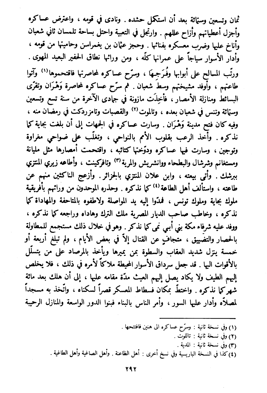 ورتّب المسالح على أبوابها وفرجها، وسرّح عساكره لمحاصرتها فاقتحموها [1] وآتوا طاعتهم، وأوفد مشيختهم وسط شعبان. ثم سرّح عساكره لمحاصرة وهران وتقرّى البسائط ومنازلة الأمصار، فأخذت مازونة في جمادى الآخرة من سنة تسع وتسعين وستمائة وتنس في شعبان بعده، وتالموت [2] والقصبات وتامزردكت في رمضان منه، وفيه كان فتح مدينة وهران. وسارت عساكره في الجهات إلى أن بلغت بجاية كما نذكره. وأخذ الرعب بقلوب الأمم بالنواحي، وتغلّب على ضواحي مغراوة وتوجين، وسارت فيها عساكره ودوّختها كتائبه، واقتحمت أمصارها مثل مليانة ومستغانم وشرشال والبطحاء ووانشريش والمرية [3] وتافركينت، وأطاعه زيري المنتزي ببرشك. وأتى بيعته، وابن علان المنتزي بالجزائر. وأزعج الناكثين منهم عن طاعته، واستألف أهل الطاعة [4] كما نذكره. وحذره الموحدون من ورائهم بإفريقية ملوك بجاية وملوك تونس، فمدّوا إليه يد المواصلة ولاطفوه بالمتاحفة والمهاداة كما نذكره، وخاطب صاحب الديار المصرية ملك الترك وهاداه وراجعه كما نذكره، ووفد عليه شرفاء مكة بني أبي نمى كما نذكر. وهو في خلال ذلك مستجمع للمطاولة بالحصار والتضييق، متجاف عن القتال إلّا في بعض الأيام، ولم تبلغ أربعة أو خمسة ينزل شديد العقاب والسطوة بمن يميرها ويأخذ بالمرصاد على من يتسلّل بالأقوات اليها. قد جعل سرداق الأسوار المحيطة ملاكا لأمره في ذلك، فلا يخلص إليهم الطيف ولا يكاد يصل إليهم العيث مدّة مقامه عليها، إلى أن هلك بعد مائة شهر كما نذكره. واختطّ بمكان فسطاط المعسكر قصرا لسكناه، واتّخذ به مسجدا لمصلّاه وأدار عليها السور، وأمر الناس بالبناء فبنوا الدور الواسعة والمنازل الرحيبة