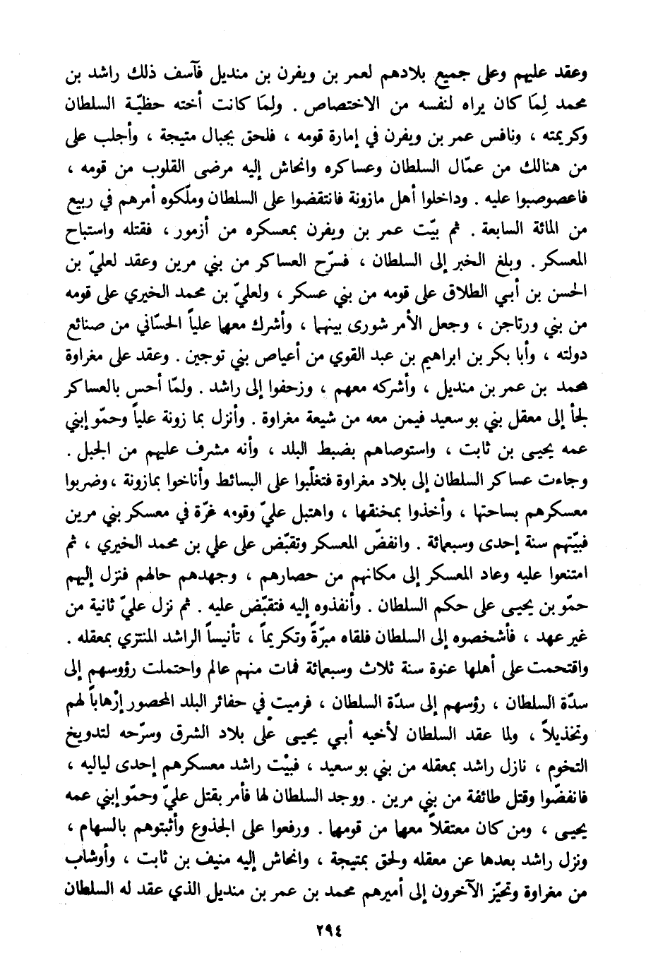 واقتحمت على أهلها عنوة سنة ثلاث وسبعمائة فمات منهم عالم واحتملت رءوسهم إلى سدّة السلطان، رءوسهم إلى سدّة السلطان، فرميت في حفائر البلد المحصور إرهابا لهم وتخذيلا، ولما عقد السلطان لأخيه أبي يحيى على بلاد الشرق وسرّحه لتدويخ التخوم، نازل راشد بمعقله من بني بو سعيد، فبيت راشد معسكرهم إحدى لياليه، فانفضّوا وقتل طائفة من بني مرين. ووجد السلطان لها فأمر بقتل عليّ وحمّو ابني عمه يحيى، ومن كان معتقلا معهما من قومهما. ورفعوا على الجذوع وأثبتوهم بالسهام، ونزل راشد بعدها عن معقلة ولحق بمتيجة، وانحاش إليه منيف بن ثابت، وأوشاب من مغراوة وتحيّز الآخرون إلى أميرهم محمد بن عمر بن منديل الّذي عقد له السلطان