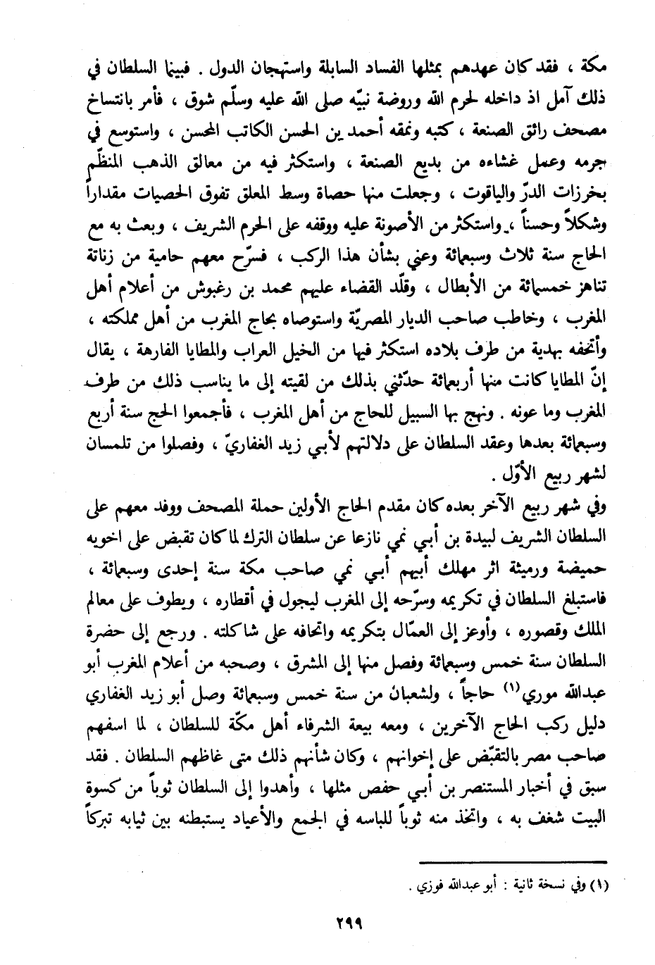 مكة، فقد كان عهدهم بمثلها الفساد السابلة واستهجان الدول. فبينما السلطان في ذلك آمل إذ داخله لحرم الله وروضة نبيّه صلى الله عليه وسلّم شوق، فأمر بانتساخ مصحف رائق الصنعة، كتبه ونمقه أحمد بن الحسن الكاتب المحسن، واستوسع في جرمه وعمل غشاءه من بديع الصنعة، واستكثر فيه من معالق الذهب المنظّم بخرزات الدرّ والياقوت، وجعلت منها حصاة وسط المعلق تفوق الحصيات مقدارا وشكلا وحسنا، واستكثر من الأصونة عليه ووقفه على الحرم الشريف، وبعث به مع الحاج سنة ثلاث وسبعمائة وعني بشأن هذا الركب، فسرّح معهم حامية من زناتة تناهز خمسمائة من الأبطال، وقلّد القضاء عليهم محمد بن رغبوش من أعلام أهل المغرب، وخاطب صاحب الديار المصريّة واستوصاه بحاج المغرب من أهل مملكته، وأتحفه بهدية من طرف بلاده استكثر فيها من الخيل العراب والمطايا الفارهة، يقال إنّ المطايا كانت منها أربعمائة حدّثني بذلك من لقيته إلى ما يناسب ذلك من طرف المغرب وما عونه. ونهج بها السبيل للحاج من أهل المغرب، فأجمعوا الحج سنة أربع سبعمائة بعدها وعقد السلطان على دلالتهم لأبي زيد الغفاريّ، وفصلوا من تلمسان لشهر ربيع الأوّل.