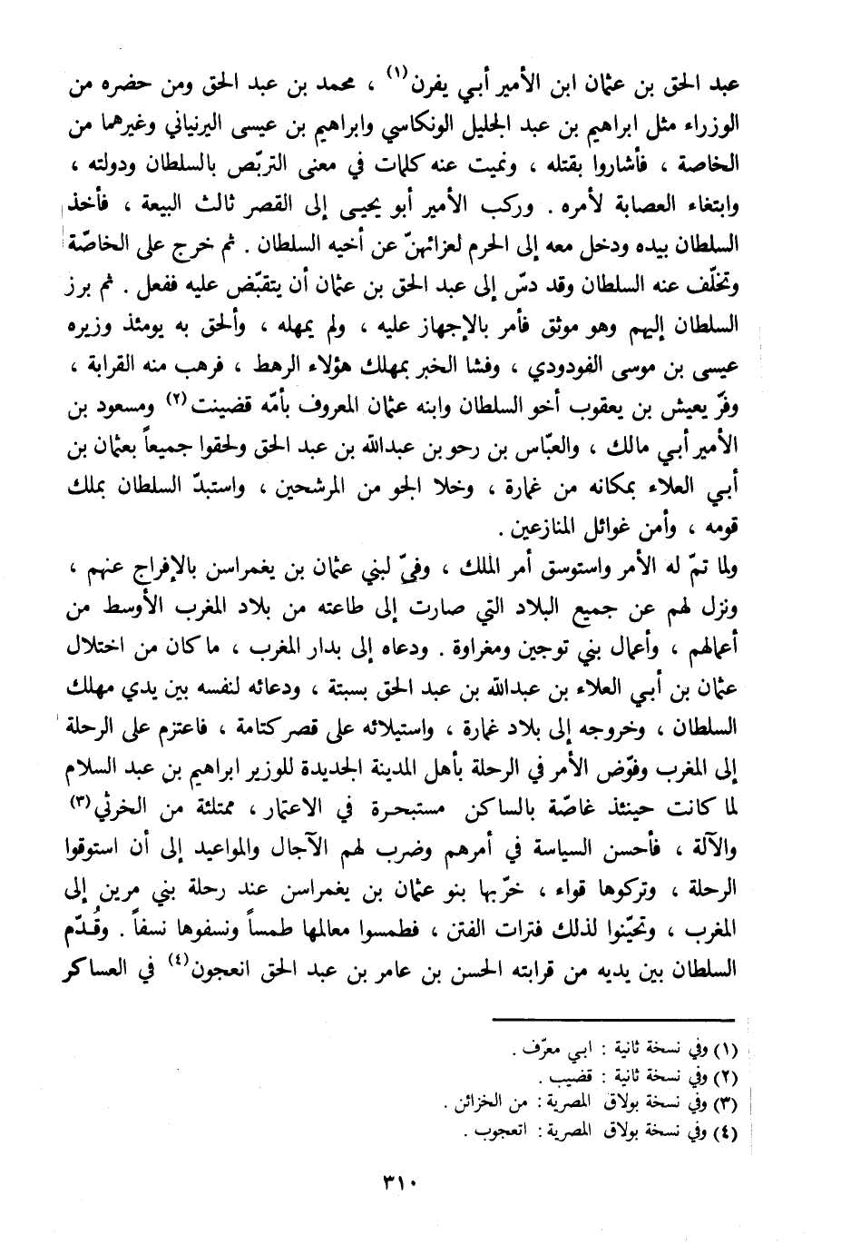 عبد الحق بن عثمان ابن الأمير أبي يفرن [1] ، محمد بن عبد الحق ومن حضره من الوزراء مثل إبراهيم بن عبد الجليل الونكاسي وإبراهيم بن عيسى اليرنياني وغيرهما من الخاصة، فأشاروا بقتله، ونميت عنه كلمات في معنى التربّص بالسلطان ودولته، وابتغاء العصابة لأمره. وركب الأمير أبو يحيى إلى القصر ثالث البيعة، فأخذ السلطان بيده ودخل معه إلى الحرم لعزائهنّ عن أخيه السلطان. ثم خرج على الخاصّة وتخلّف عنه السلطان وقد دسّ إلى عبد الحق بن عثمان أن يتقبّض عليه ففعل. ثم برز السلطان إليهم وهو موثق فأمر بالإجهاز عليه، ولم يمهله، وألحق به يومئذ وزيره عيسى بن موسى الفودودي، وفشا الخبر بمهلك هؤلاء الرهط، فرهب منه القرابة، وفرّ يعيش بن يعقوب أخو السلطان وابنه عثمان المعروف بأمّه قضينت [2] ومسعود بن الأمير أبي مالك، والعبّاس بن رحو بن عبد الله بن عبد الحق ولحقوا جميعا بعثمان بن أبي العلاء بمكانه من غمارة، وخلا الجو من المرشحين، واستبدّ السلطان بملك قومه، وأمن غوائل المنازعين.