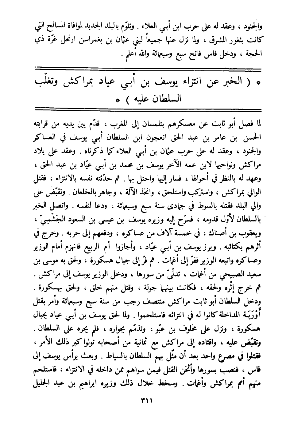 ودخل السلطان أبو ثابت مراكش منتصف رجب من سنة سبع وسبعمائة وأمر بقتل أوربة المداخلة كانوا له في انتزائه فاستلحموا. ولما لحق يوسف بن أبي عياد بجبال هسكورة، ونزل على مخلوف بن عبّو، وتذمّم بجواره، فلم يجره على السلطان.