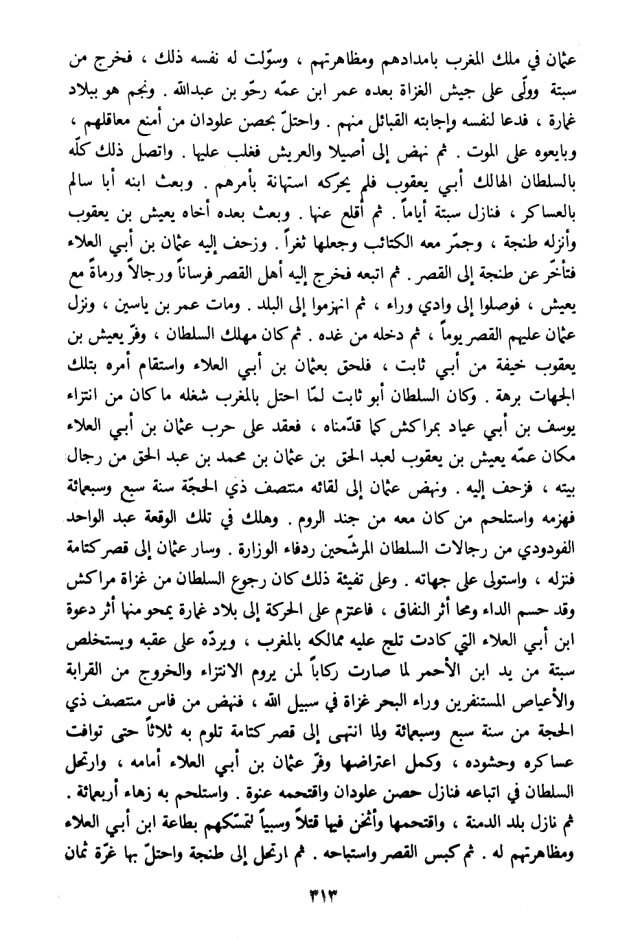 عثمان في ملك المغرب بامدادهم ومظاهرتهم، وسوّلت له نفسه ذلك، فخرج من سبتة وولّى على جيش الغزاة بعده عمر ابن عمّه رحّو بن عبد الله. ونجم هو ببلاد غمارة، فدعا لنفسه وإجابته القبائل منهم. واحتلّ بحصن علودان من أمنع معاقلهم، وبايعوه على الموت. ثم نهض إلى أصيلا والعريش فغلب عليها. واتصل ذلك كلّه بالسلطان الهالك أبي يعقوب فلم يحركه استهانة بأمرهم. وبعث ابنه أبا سالم بالعساكر، فنازل سبتة أياما. ثم أقلع عنها. وبعث بعده أخاه يعيش بن يعقوب وأنزله طنجة، وجمّر معه الكتائب وجعلها ثغرا. وزحف إليه عثمان بن أبي العلاء فتأخّر عن طنجة إلى القصر. ثم اتبعه فخرج إليه أهل القصر فرسانا ورجالا ورماة مع يعيش، فوصلوا إلى وادي وراء، ثم انهزموا إلى البلد. ومات عمر بن ياسين، ونزل عثمان عليهم القصر يوما، ثم دخله من غده. ثم كان مهلك السلطان، وفرّ يعيش بن يعقوب خيفة من أبي ثابت، فلحق بعثمان بن أبي العلاء واستقام أمره بتلك الجهات برهة. وكان السلطان أبو ثابت لمّا احتل بالمغرب شغله ما كان من انتزاء يوسف بن أبي عياد بمراكش كما قدّمناه، فعقد على حرب عثمان بن أبي العلاء مكان عمّه يعيش بن يعقوب لعبد الحق بن عثمان بن محمد بن عبد الحق من رجال بيته، فزحف إليه. ونهض عثمان إلى لقائه منتصف ذي الحجّة سنة سبع وسبعمائة فهزمه واستلحم من كان معه من جند الروم. وهلك في تلك الوقعة عبد الواحد الفودودي من رجالات السلطان المرشّحين ردفاء الوزارة. وسار عثمان إلى قصر كتامة فنزله، واستولى على جهاته. وعلى تفيئة ذلك كان رجوع السلطان من غزاة مراكش وقد حسم الداء ومحا أثر النفاق، فاعتزم على الحركة إلى بلاد غمارة يمحو منها أثر دعوة ابن أبي العلاء التي كادت تلج عليه ممالكه بالمغرب، ويردّه على عقبه ويستخلص سبتة من يد ابن الأحمر لما صارت ركابا لمن يروم الانتزاء والخروج من القرابة والأعياص المستنفرين وراء البحر غزاة في سبيل الله، فنهض من فاس منتصف ذي الحجة من سنة سبع وسبعمائة ولما انتهى إلى قصر كتامة تلوم به ثلاثا حتى توافت عساكره وحشوده، وكمل اعتراضها وفرّ عثمان بن أبي العلاء أمامه، وارتحل السلطان في اتباعه فنازل حصن علودان واقتحمه عنوة. واستلحم به زهاء أربعمائة.