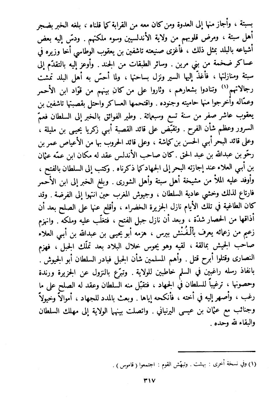 بسبتة، وأجاز منها إلى العدوة ومن كان معه من القرابة كما قلناه، بلغه الخبر بضجر أهل سبتة، ومرض قلوبهم من ولاية الأندلسيين وسوء ملكتهم. ودسّ إليه بعض أشياعه بالبلد بمثل ذلك، فأغزى صنيعته تاشفين بن يعقوب الوطاسي أخا وزيره في عساكر ضخمة من بني مرين. وسائر الطبقات من الجند. وأوعز إليه بالتقدّم إلى سبتة ومنازلتها، فأغذّ إليها السير ونزل بساحتها، ولما أحسّ به أهل البلد تمشت رجالاتهم [1] وتنادوا بشعارهم، وثاروا على من كان بينهم من قوّاد ابن الأحمر وعمّاله وأخرجوا منها حاميته وجنوده. واقتحمها العساكر واحتل بقصبتها تاشفين بن يعقوب عاشر صفر من سنة تسع وسبعمائة. وطير الفوائق بالخبر إلى السلطان فعمّ السرور وعظم شأن الفرح. وتقبّض على قائد القصبة أبي زكريا يحيى بن مليلة، وعلى قائد البحر أبي الحسن بن كماشة، وعلى قائد الحروب بها من الأعياص عمر بن رحّو بن عبد الله بن عبد الحق. كان صاحب الأندلس عقد له مكان ابن عمّه عثمان بن أبي العلاء عند إجازته البحر إلى الجهاد كما ذكرناه. وكتب إلى السلطان بالفتح، وأوفد عليه الملأ من مشيخة أهل سبتة وأهل الشورى. وبلغ الخبر إلى ابن الأحمر فارتاع لذلك وخشي عادية السلطان، وجيوش المغرب حين انتهوا إلى الفرضة. وقد كان الطاغية في تلك الأيام نازل الجزيرة الخضراء، وأقلع عنها على الصلح بعد أن أذاقها من الحصار شدّة، وبعد أن نازل جبل الفتح، فتغلّب عليه وملكه. وانهزم زعيم من زعمائه يعرف بألفنش بيرس، هزمه أبو يحيى بن عبد الله بن أبي العلاء صاحب الجيش بمالقة، لقيه وهو يجوس خلال البلاد بعد تملّك الجبل، فهزم النصارى وقتلوا أبرح قتل. وأهم المسلمين شأن الجبل فبادر السلطان أبو الجيوش.