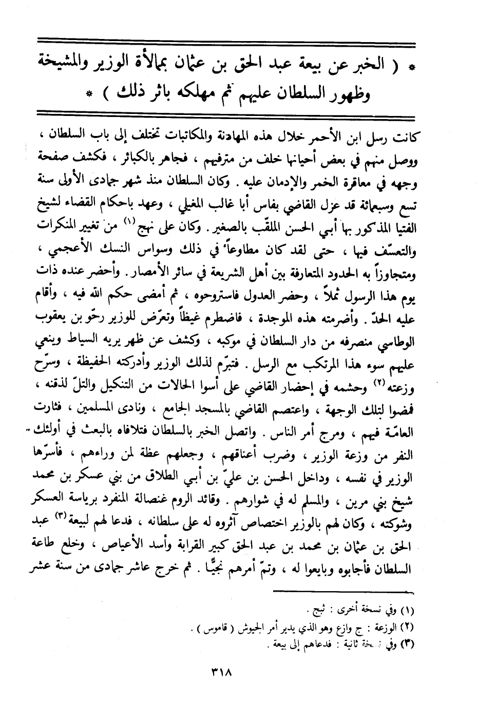 (الخبر عن بيعة عبد الحق بن عثمان بممالأة الوزير والمشيخة وظهور السلطان عليهم ثم مهلكه باثر ذلك)