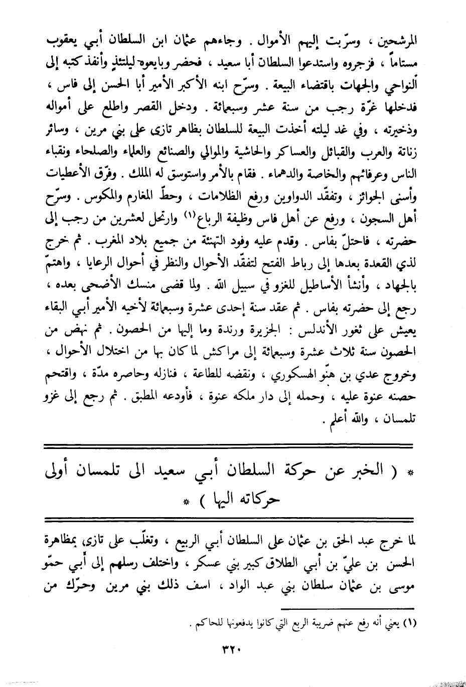 المرشحين، وسرّبت إليهم الأموال. وجاءهم عثمان ابن السلطان أبي يعقوب مستاما، فزجروه واستدعوا السلطان أبا سعيد، فحضر وبايعوه ليلتئذ وأنفذ كتبه إلى النواحي والجهات باقتضاء البيعة. وسرّح ابنه الأكبر الأمير أبا الحسن إلى فاس، فدخلها غرّة رجب من سنة عشر وسبعمائة. ودخل القصر واطلع على أمواله وذخيرته، وفي غد ليلته أخذت البيعة للسلطان بظاهر تازي على بني مرين، وسائر زناتة والعرب والقبائل والعساكر والحاشية والموالي والصنائع والعلماء والصلحاء ونقباء الناس وعرفائهم والخاصة والدهماء. فقام بالأمر واستوسق له الملك. وفرّق الأعطيات وأسنى الجوائز، وتفقّد الدواوين ورفع الظلامات، وحطّ المغارم والمكوس. وسرّح أهل السجون، ورفع عن أهل فاس وظيفة الرباع [1] وارتحل لعشرين من رجب إلى حضرته، فاحتلّ بفاس. وقدم عليه وفود التهنئة من جميع بلاد المغرب. ثم خرج لذي القعدة بعدها إلى رباط الفتح لتفقّد الأحوال والنظر في أحوال الرعايا، واهتمّ بالجهاد، وأنشأ الأساطيل للغزو في سبيل الله. ولما قضى منسك الأضحى بعده، رجع إلى حضرته بفاس. ثم عقد سنة إحدى عشرة وسبعمائة لأخيه الأمير أبي البقاء يعيش على ثغور الأندلس: الجزيرة ورندة وما إليها من الحصون. ثم نهض من الحصون سنة ثلاث عشرة وسبعمائة إلى مراكش لما كان بها من اختلال الأحوال، وخروج عدي بن هنّو الهسكوري، ونقضه للطاعة، فنازله وحاصره مدّة، واقتحم حصنه عنوة عليه، وحمله إلى دار ملكه عنوة، فأودعه المطبق. ثم رجع إلى غزو تلمسان، والله أعلم.