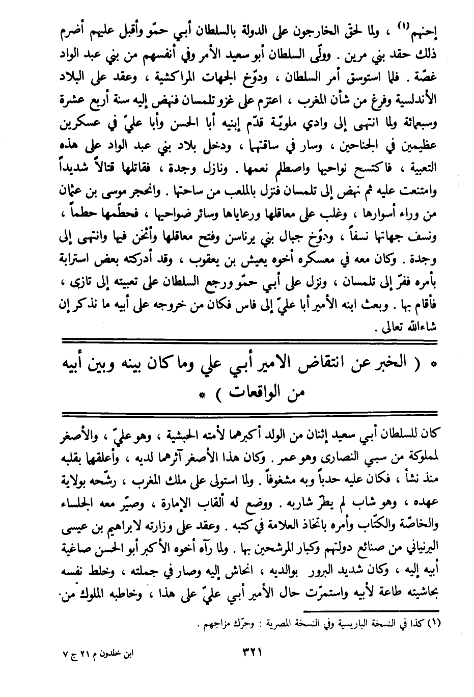 إحنهم [1] ، ولما لحق الخارجون على الدولة بالسلطان أبي حمّو وأقبل عليهم أضرم ذلك حقد بني مرين. وولّى السلطان أبو سعيد الأمر وفي أنفسهم من بني عبد الواد غصّة. فلما استوسق أمر السلطان، ودوّخ الجهات المراكشية، وعقد على البلاد الأندلسية وفرغ من شأن المغرب، اعتزم على غزو تلمسان فنهض إليه سنة أربع عشرة وسبعمائة ولما انتهى إلى وادي ملويّة قدّم ابنيه أبا الحسن وأبا عليّ في عسكرين عظيمين في الجناحين، وسار في ساقتهما، ودخل بلاد بني عبد الواد على هذه التعبية، فاكتسح نواحيها واصطلم نعمها. ونازل وجدة، فقاتلها قتالا شديدا وامتنعت عليه ثم نهض إلى تلمسان فنزل بالملعب من ساحتها. وانحجر موسى بن عثمان من وراء أسوارها، وغلب على معاقلها ورعاياها وسائر ضواحيها، فحطّمها حطما، ونسف جهاتها نسفا، ودوّخ جبال بني يرناسن وفتح معاقلها وأثخن فيها وانتهى إلى وجدة. وكان معه في معسكره أخوه يعيش بن يعقوب، وقد أدركته بعض استرابة بأمره ففرّ إلى تلمسان، ونزل على أبي حمّو ورجع السلطان على تعبيته إلى تازى، فأقام بها. وبعث ابنه الأمير أبا عليّ إلى فاس فكان من خروجه على أبيه ما نذكر إن شاء الله تعالى.