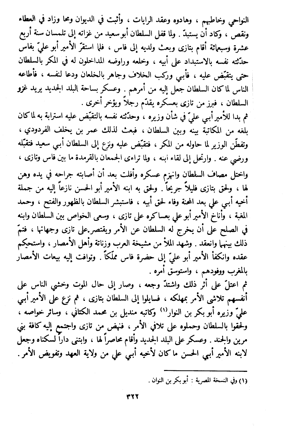 النواحي وخاطبهم، وهادوه وعقد الرايات، وأثبت في الديوان ومحا وزاد في العطاء ونقص، وكاد أن يستبدّ. ولما قفل السلطان أبو سعيد من غزاته إلى تلمسان سنة أربع عشرة وسبعمائة أقام بتازى وبعث ولديه إلى فاس، فلما استقرّ الأمير أبو عليّ بفاس حدّثته نفسه بالاستبداد على أبيه، وخلعه وراوضه المداخلون له في المكر بالسلطان حتى يتقبّض عليه، فأبي وركب الخلاف وجاهر بالخلعان ودعا لنفسه، فأطاعه الناس لما كان السلطان جعل إليه من أمرهم. وعسكر بساحة البلد الجديد يريد غزو السلطان، فبرز من تازى بعسكره يقدّم رجلا ويؤخر أخرى.