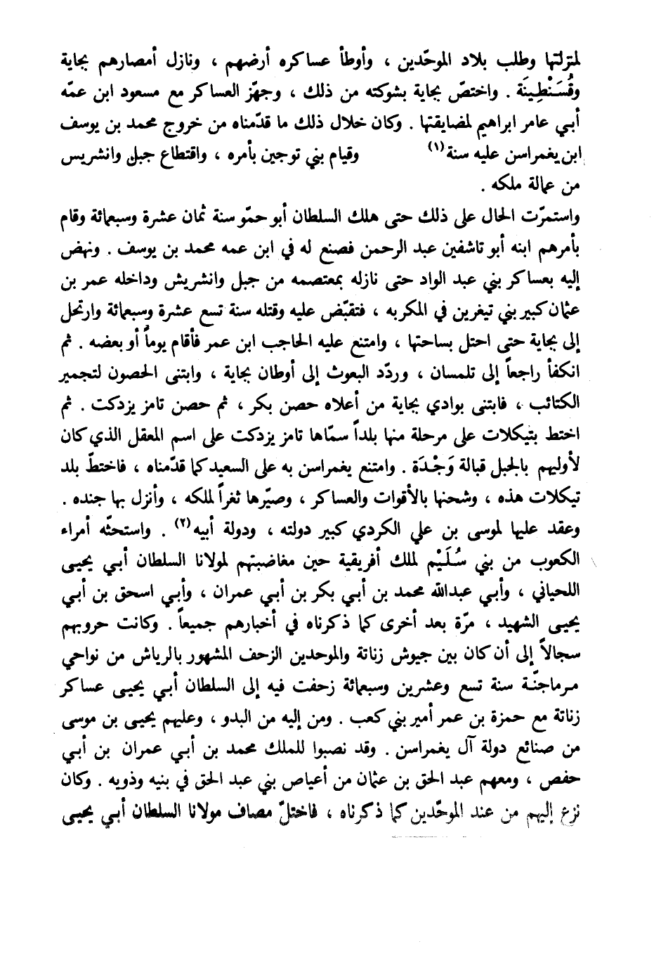 لمنزلتها وطلب بلاد الموحّدين، وأوطأ عساكره أرضهم، ونازل أمصارهم بجاية وقسنطينة. واختصّ بجاية بشوكته من ذلك، وجهّز العساكر مع مسعود ابن عمّه أبي عامر إبراهيم لمضايقتها. وكان خلال ذلك ما قدّمناه من خروج محمد بن يوسف ابن يغمراسن عليه سنة [1] وقيام بني توجين بأمره، واقتطاع جبل وانشريس من عمالة ملكه.