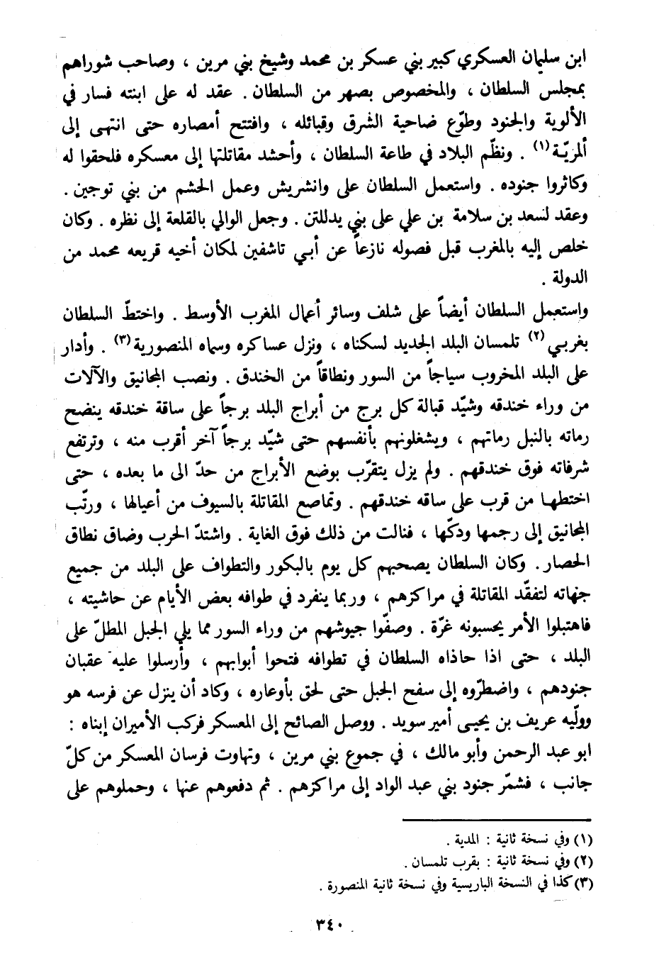 واستعمل السلطان أيضا على شلف وسائر أعمال المغرب الأوسط. واختطّ السلطان بغربي [2] تلسمان البلد الجديد لسكناه، ونزل عساكره وسماه المنصورية [3] . وأدار على البلد المخروب سياجا من السور ونطاقا من الخندق. ونصب المجانيق والآلات من وراء خندقه وشيّد قبالة كل برج من أبراج البلد برجا على ساقة خندقه ينضح رماته بالنبل رماتهم، ويشغلونهم بأنفسهم حتى شيّد برجا آخر أقرب منه، وترتفع شرفاته فوق خندقهم. ولم يزل يتقرّب بوضع الأبراج من حدّ إلى ما بعده، حتى اختطها من قرب على ساقه خندقهم. وتماصع المقاتلة بالسيوف من أعيالها، ورتّب المجانيق إلى رجمها ودكّها، فنالت من ذلك فوق الغاية. واشتدّ الحرب وضاق نطاق الحصار. وكان السلطان يصحبهم كل يوم بالبكور والتطواف على البلد من جميع جهاته لتفقّد المقاتلة في مراكزهم، وربما ينفرد في طوافه بعض الأيام عن حاشيته، فاهتبلوا الأمر يحسبونه غرّة. وصفّوا جيوشهم من وراء السور مما يلي الجبل المطلّ على البلد، حتى إذا حاذاه السلطان في تطوافه فتحوا أبوابهم، وأرسلوا عليه عقبان جنودهم، واضطرّوه إلى سفح الجبل حتى لحق بأوعاره، وكاد أن ينزل عن فرسه هو وولّيه عريف بن يحيى أمير سويد. ووصل الصائح إلى المعسكر فركب الأميران ابناه: