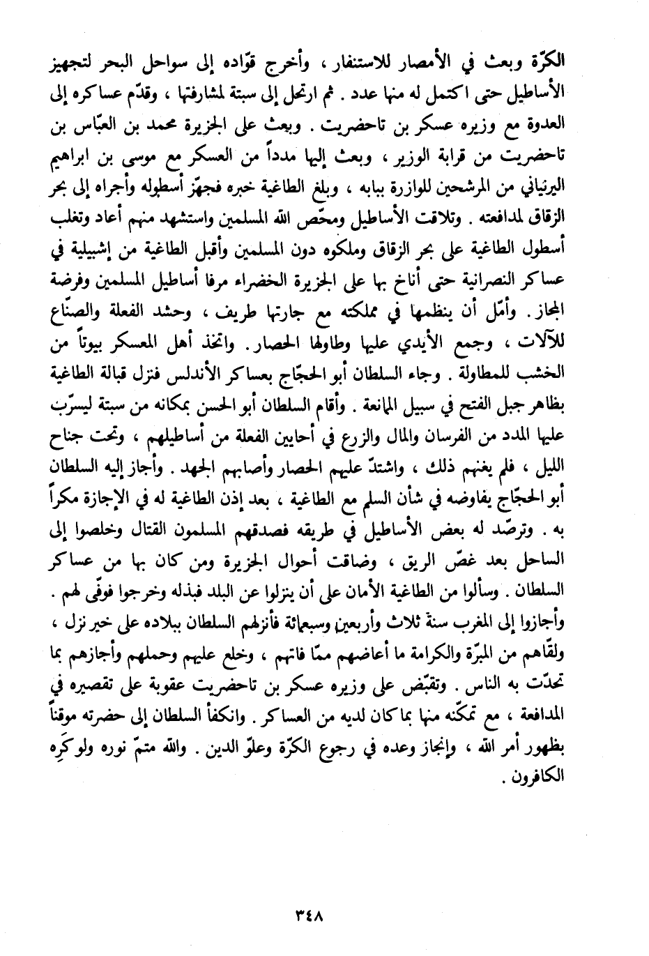 الكرّة وبعث في الأمصار للاستنفار، وأخرج قوّاده إلى سواحل البحر لتجهيز الأساطيل حتى اكتمل له منها عدد. ثم ارتحل إلى سبتة لمشارفتها، وقدّم عساكره إلى العدوة مع وزيره عسكر بن تاحضريت. وبعث على الجزيرة محمد بن العبّاس بن تاحضريت من قرابة الوزير، وبعثه إليها مددا من العسكر مع موسى بن إبراهيم اليرنياني من المرشحين للوزارة ببابه، وبلغ الطاغية خبره فجهّز أسطوله وأجراه إلى بحر الزقاق لمدافعته. وتلاقت الأساطيل ومحّص الله المسلمين واستشهد منهم أعاد وتغلب أسطول الطاغية على بحر الزقاق وملكوه دون المسلمين وأقبل الطاغية من إشبيلية في عساكر النصرانية حتى أناخ بها على الجزيرة الخضراء مرفا أساطيل المسلمين وفرضة المجاز. وأمّل أن ينظمها في مملكته مع جارتها طريف، وحشد الفعلة والصنّاع للآلات، وجمع الأيدي عليها وطاولها الحصار. واتخذ أهل المعسكر بيوتا من الخشب للمطاولة. وجاء السلطان أبو الحجّاج بعساكر الأندلس فنزل قبالة الطاغية بظاهر جبل الفتح في سبيل الممانعة. وأقام السلطان أبو الحسن بمكانه من سبتة ليسرّب عليها المدد من الفرسان والمال والزرع في أحايين الفعلة من أساطيلهم، وتحت جناح الليل، فلم يغنهم ذلك، واشتدّ عليهم الحصار وأصابهم الجهد. وأجاز إليه السلطان أبو الحجّاج يفاوضه في شأن السلم مع الطاغية، بعد إذن الطاغية له في الإجازة مكرا به وترصّد له بعض الأساطيل في طريقه فصدقهم المسلمون القتال وخلصوا إلى الساحل بعد غصّ الريق، وضاقت أحوال الجزيرة ومن كان بها من عساكر السلطان. وسألوا من الطاغية الأمان على أن ينزلوا عن البلد فبذله وخرجوا فوفّى لهم.