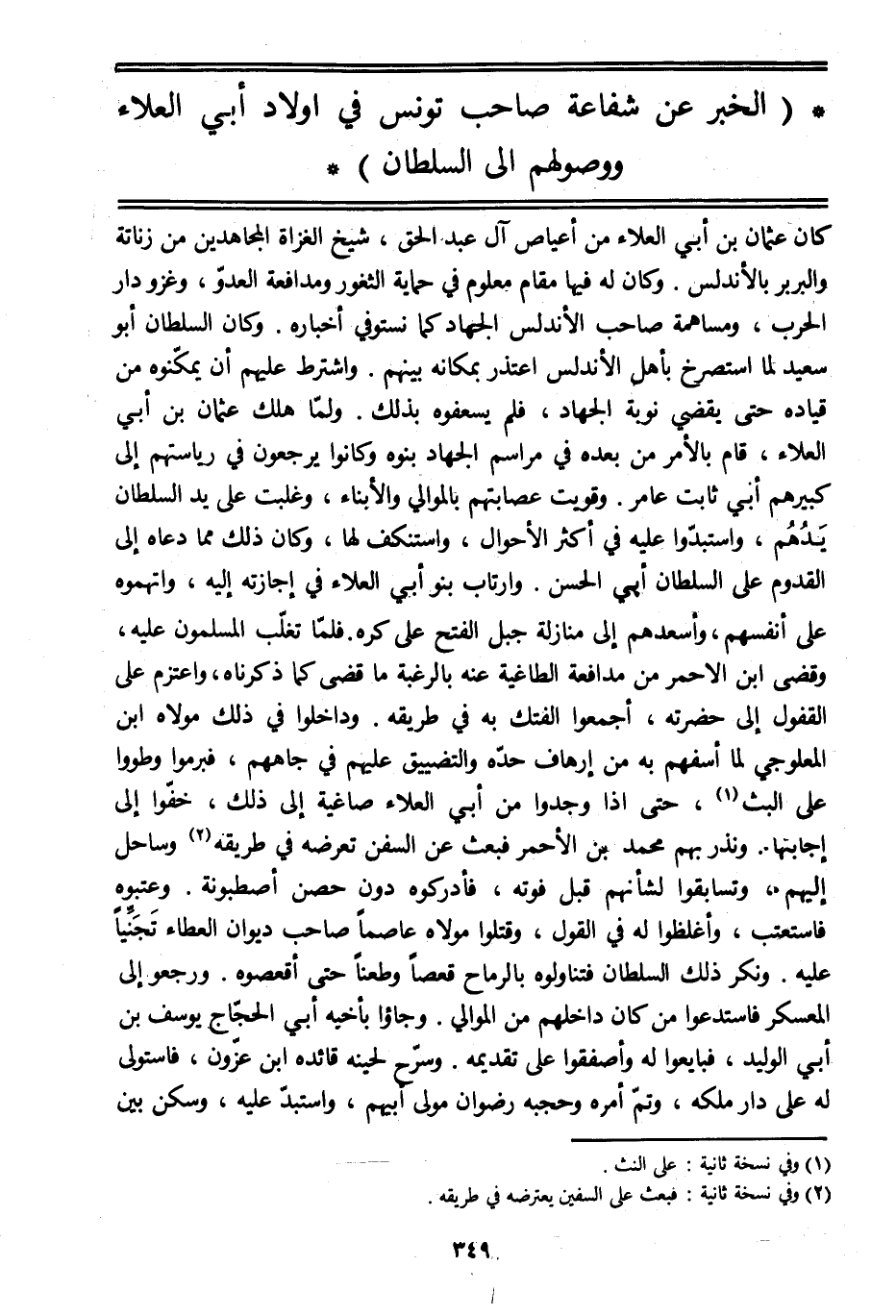 (الخبر عن شفاعة صاحب تونس في أولاد أبي العلاء ووصولهم الى السلطان)