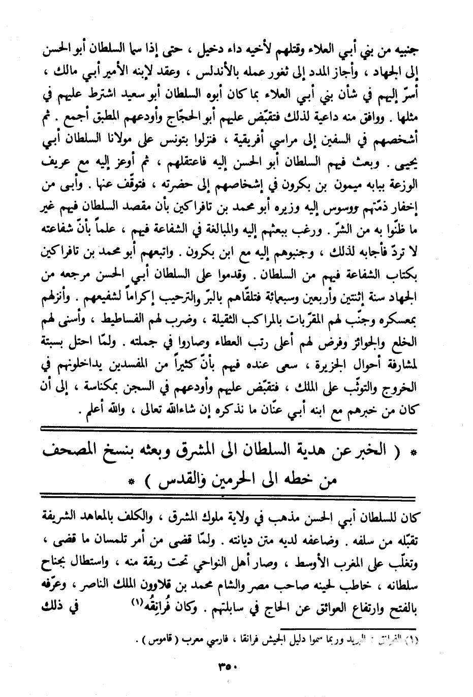 (الخبر عن هدية السلطان الى المشرق وبعثه بنسخ المصحف من خطه الى الحرمين والقدس)
