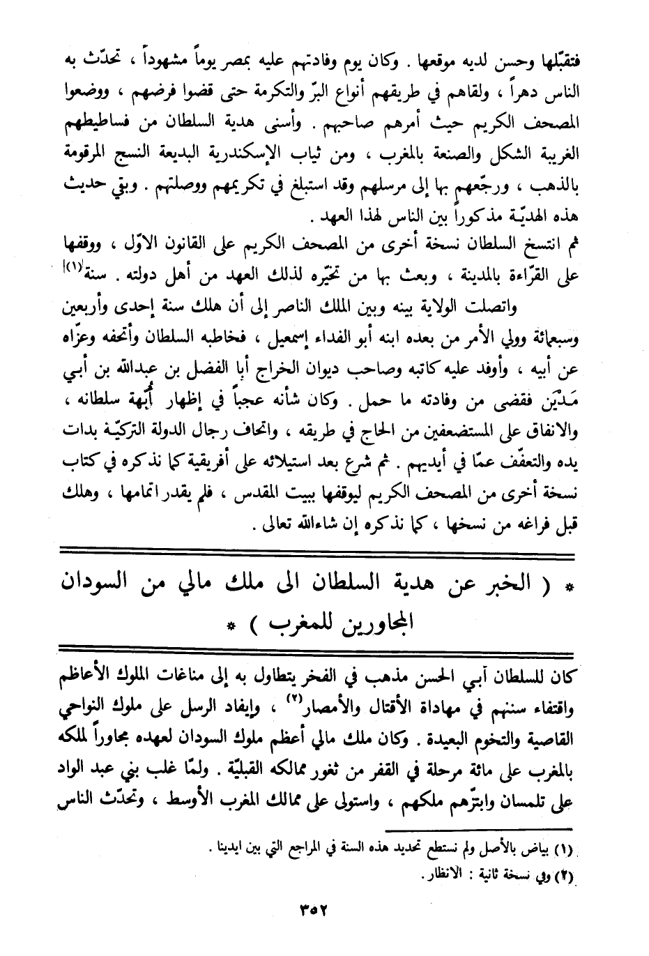 (الخبر عن هدية السلطان الى ملك مالي من السودان المجاورين للمغرب)
