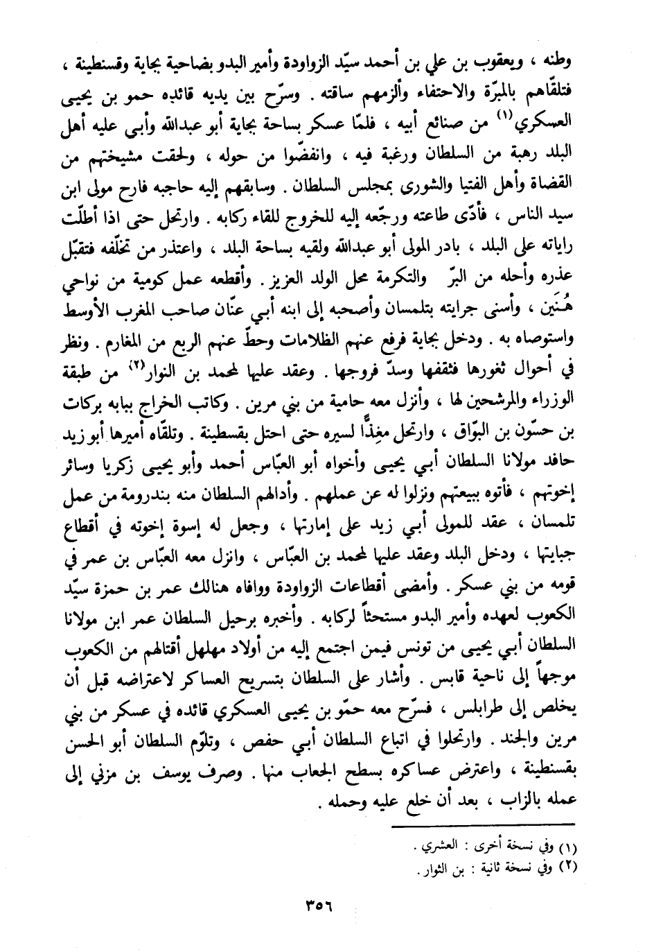 وطنه، ويعقوب بن علي بن أحمد سيّد الزواودة وأمير البدو بضاحية بجاية وقسنطينة، فتلقّاهم بالمبرّة والاحتفاء وألزمهم ساقته. وسرّح بين يديه قائده حمو بن يحيى العسكري [1] من صنائع أبيه، فلمّا عسكر بساحة بجاية أبو عبد الله وأبي عليه أهل البلد رهبة من السلطان ورغبة فيه، وانفضّوا من حوله، ولحقت مشيختهم من القضاة وأهل الفتيا والشورى بمجلس السلطان. وسابقهم إليه حاجبه فارح مولى ابن سيد الناس، فأدّى طاعته ورجّعه إليه للخروج للقاء ركابه. وارتحل حتى إذا أطلّت راياته على البلد، بادر المولى أبو عبد الله ولقيه بساحة البلد، واعتذر من تخلّفه فتقبّل عذره وأحله من البرّ والتكرمة محل الولد العزيز. وأقطعه عمل كومية من نواحي هنين، وأسنى جرايته بتلمسان وأصحبه إلى ابنه أبي عنّان صاحب المغرب الأوسط واستوصاه به. ودخل بجاية فرفع عنهم الظلامات وحطّ عنهم الربع من المغارم. ونظر في أحوال ثغورها فثقفها وسدّ فروجها. وعقد عليها لمحمد بن النوار [2] من طبقة الوزراء والمرشحين لها، وأنزل معه حامية من بني مرين. وكاتب الخراج ببابه بركات بن حسّون بن البوّاق، وارتحل مغذّا لسيرة حتى احتل بقسطينة. وتلقّاه أميرها أبو زيد حافد مولانا السلطان أبي يحيى وأخواه أبو العبّاس أحمد وأبو يحيى زكريا وسائر إخوتهم، فأتوه ببيعتهم ونزلوا له عن عملهم. وأدالهم السلطان منه بندرومة من عمل تلمسان، عقد للمولى أبي زيد على إمارتها، وجعل له إسوة إخوته في أقطاع جبايتها، ودخل البلد وعقد عليها لمحمد بن العبّاس، وانزل معه العبّاس بن عمر في قومه من بني عسكر. وأمضى أقطاعات الزواودة ووافاه هنالك عمر بن حمزة سيّد الكعوب لعهده وأمير البدو مستحثا لركابه. وأخبره برحيل السلطان عمر ابن مولانا السلطان أبي يحيى من تونس فيمن اجتمع إليه من أولاد مهلهل أقتالهم من الكعوب موجها إلى ناحية قابس. وأشار على السلطان بتسريح العساكر لاعتراضه قبل أن يخلص إلى طرابلس، فسرّح معه حمّو بن يحيى العسكري قائده في عسكر من بني مرين والجند. وارتحلوا في اتباع السلطان أبي حفص، وتلوّم السلطان أبو الحسن بقسنطينة، واعترض عساكره بسطح الجعاب منها. وصرف يوسف بن مزني إلى عمله بالزاب، بعد أن خلع عليه وحمله.