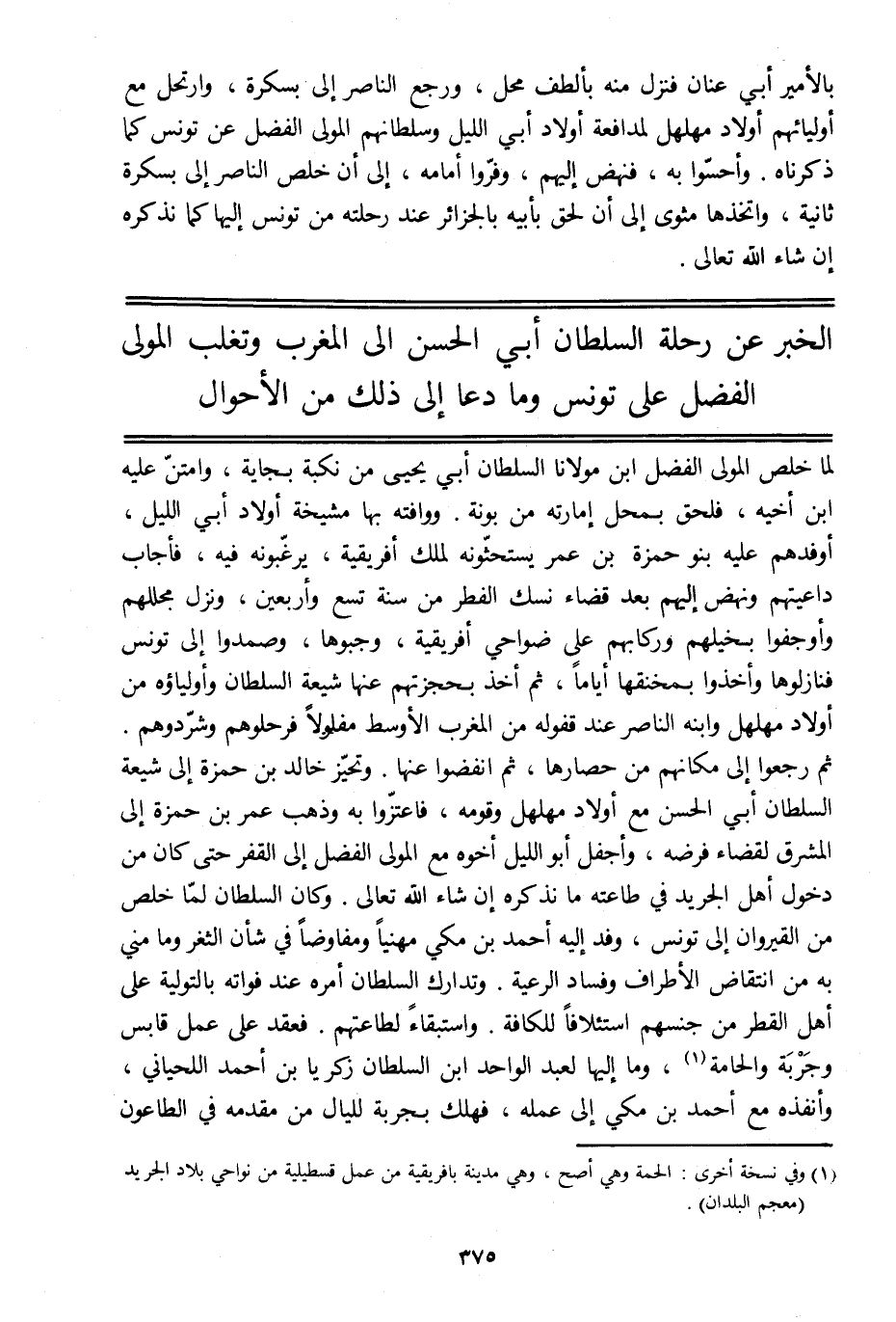 بالأمير أبي عنان فنزل منه بألطف محل، ورجع الناصر إلى بسكرة، وارتحل مع أوليائهم أولاد مهلهل لمدافعة أولاد أبي الليل وسلطانهم المولى الفضل عن تونس كما ذكرناه. وأحسّوا به، فنهض إليهم، وفرّوا أمامه، إلى أن خلص الناصر إلى بسكرة ثانية، واتخذها مثوى إلى أن لحق بأبيه بالجزائر عند رحلته من تونس إليها كما نذكره إن شاء الله تعالى.