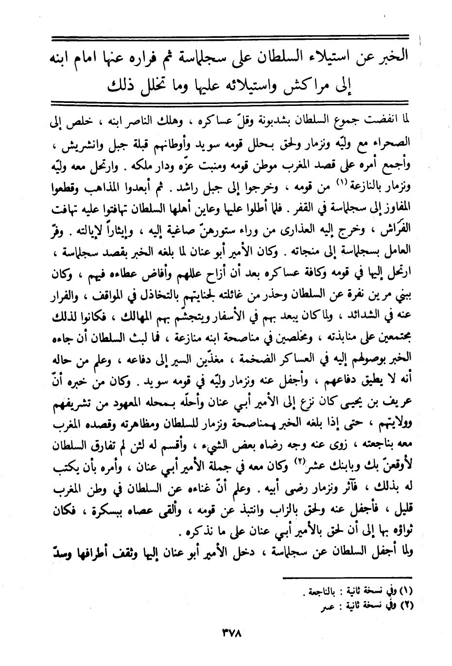 الخبر عن استيلاء السلطان على سجلماسة ثم فراره عنها امام ابنه إلى مراكش واستيلائه عليها وما تخلل ذلك