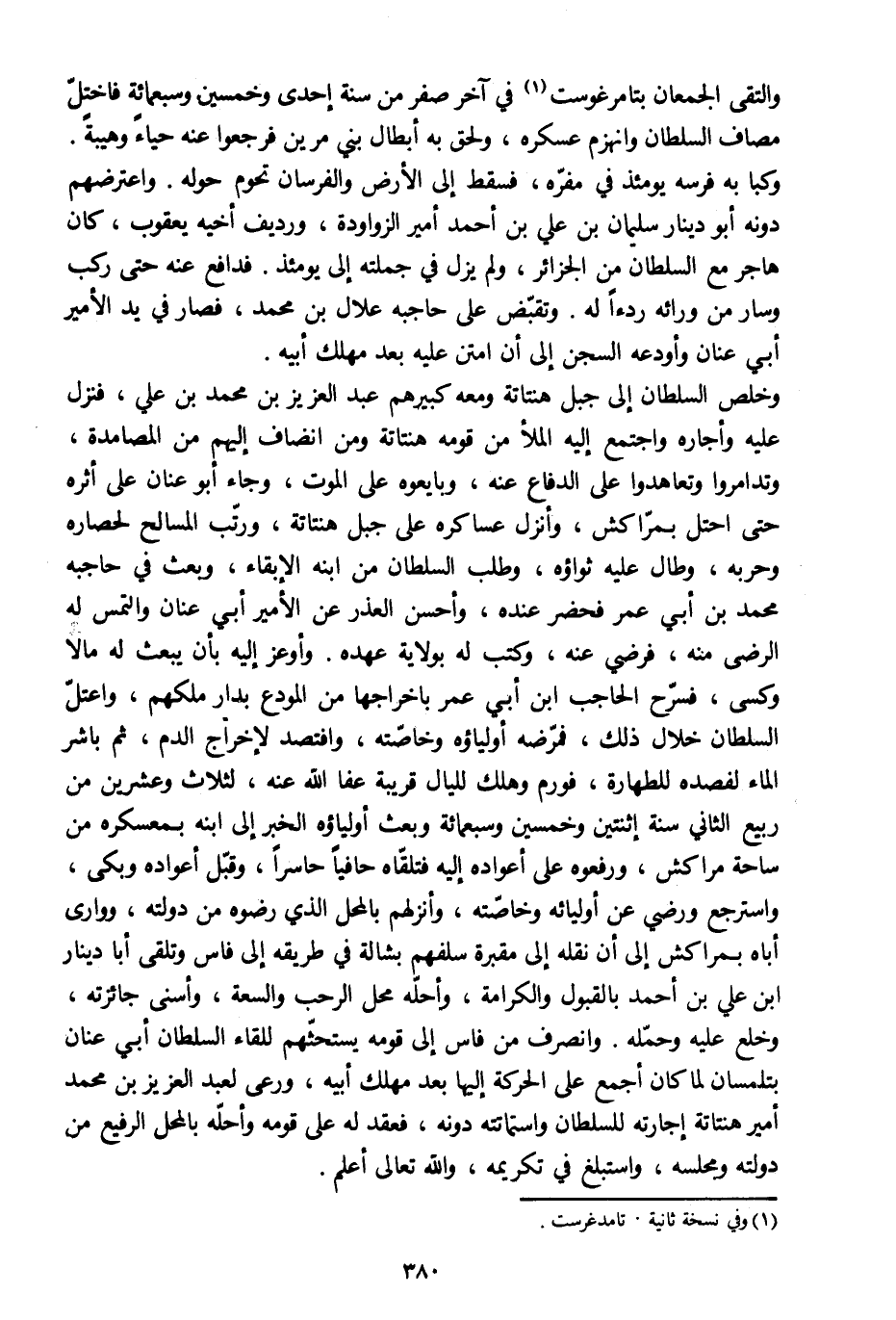 والتقى الجمعان بتامرغوست [1] في آخر صفر من سنة إحدى وخمسين وسبعمائة فاختلّ مصاف السلطان وانهزم عسكره، ولحق به أبطال بني مرين فرجعوا عنه حياء وهيبة.