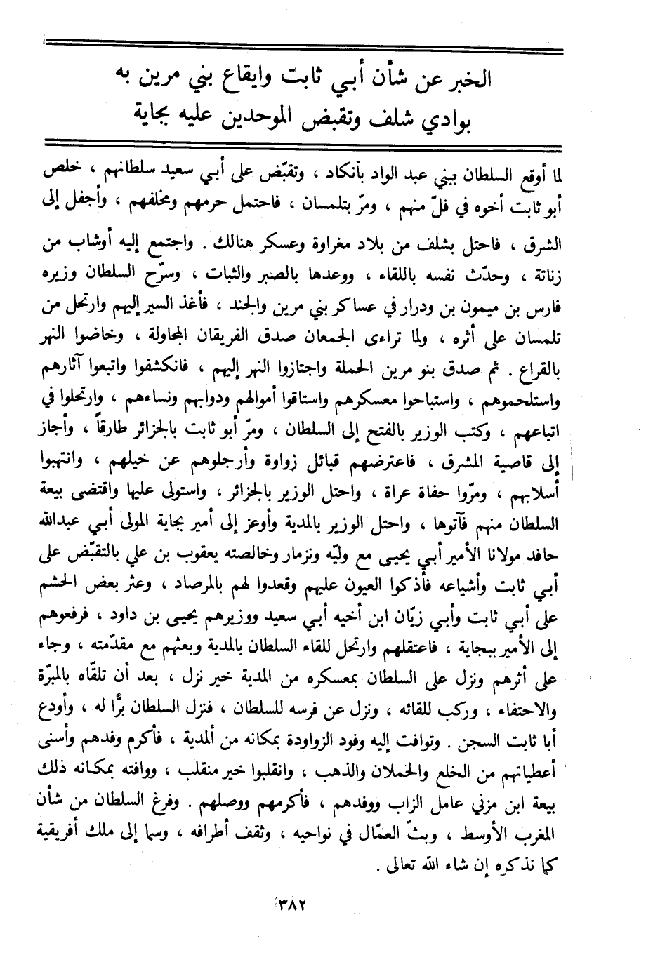 لما أوقع السلطان ببني عبد الواد بأنكاد، وتقبّض على أبي سعيد سلطانهم، خلص أبو ثابت أخوه في فلّ منهم، ومرّ بتلمسان، فاحتمل حرمهم ومخلفهم، وأجفل إلى الشرق، فاحتل بشلف من بلاد مغراوة وعسكر هنالك. واجتمع إليه أوشاب من زناتة، وحدّث نفسه باللقاء، ووعدها بالصبر والثبات، وسرّح السلطان وزيره فارس بن ميمون بن ودرار في عساكر بني مرين والجند، فأغذ السير إليهم وارتحل من تلمسان على أثره، ولما تراءى الجمعان صدق الفريقان المجاولة، وخاضوا النهر بالقراع. ثم صدق بنو مرين الحملة واجتازوا النهر إليهم، فانكشفوا واتبعوا آثارهم واستلحموهم، واستباحوا معسكرهم واستاقوا أموالهم ودوابهم ونساءهم، وارتحلوا في اتباعهم، وكتب الوزير بالفتح إلى السلطان، ومرّ أبو ثابت بالجزائر طارقا، وأجاز إلى قاصية المشرق، فاعترضهم قبائل زواوة وأرجلوهم عن خيلهم، وانتهبوا أسلابهم، ومرّوا حفاة عراة، واحتل الوزير بالجزائر، واستولى عليها واقتضى بيعة السلطان منهم فآتوها، واحتل الوزير بالمدية وأوعز إلى أمير بجاية المولى أبي عبد الله حافد مولانا الأمير أبي يحيى مع وليّه ونزمار وخالصته يعقوب بن علي بالتقبّض على أبي ثابت وأشياعه فأذكوا العيون عليهم وقعدوا لهم بالمرصاد، وعثر بعض الحشم على أبي ثابت وأبي زيّان ابن أخيه أبي سعيد ووزيرهم يحيى بن داود، فرفعوهم إلى الأمير ببجاية، فاعتقلهم وارتحل للقاء السلطان بالمدية وبعثهم مع مقدّمته، وجاء على أثرهم ونزل على السلطان بمعسكره من المدية خير نزل، بعد أن تلقّاه بالمبرّة والاحتفاء، وركب للقائه، ونزل عن فرسه للسلطان، فنزل السلطان برّا له، وأودع أبا ثابت السجن. وتوافت إليه وفود الزواودة بمكانه من المدية، فأكرم وفدهم وأسنى أعطياتهم من الخلع والحملان والذهب، وانقلبوا خير منقلب، ووافته بمكانه ذلك بيعة ابن مزني عامل الزاب ووفدهم، فأكرمهم ووصلهم. وفرغ السلطان من شأن المغرب الأوسط، وبثّ العمّال في نواحيه، وثقف أطرافه، وسما إلى ملك إفريقية كما نذكره إن شاء الله تعالى