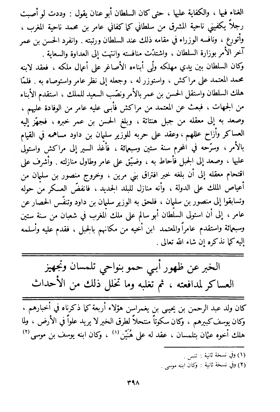الخبر عن ظهور أبي حمو بنواحي تلمسان وتجهيز العساكر لمدافعته، ثم تغلبه وما تخلل ذلك من الأحداث