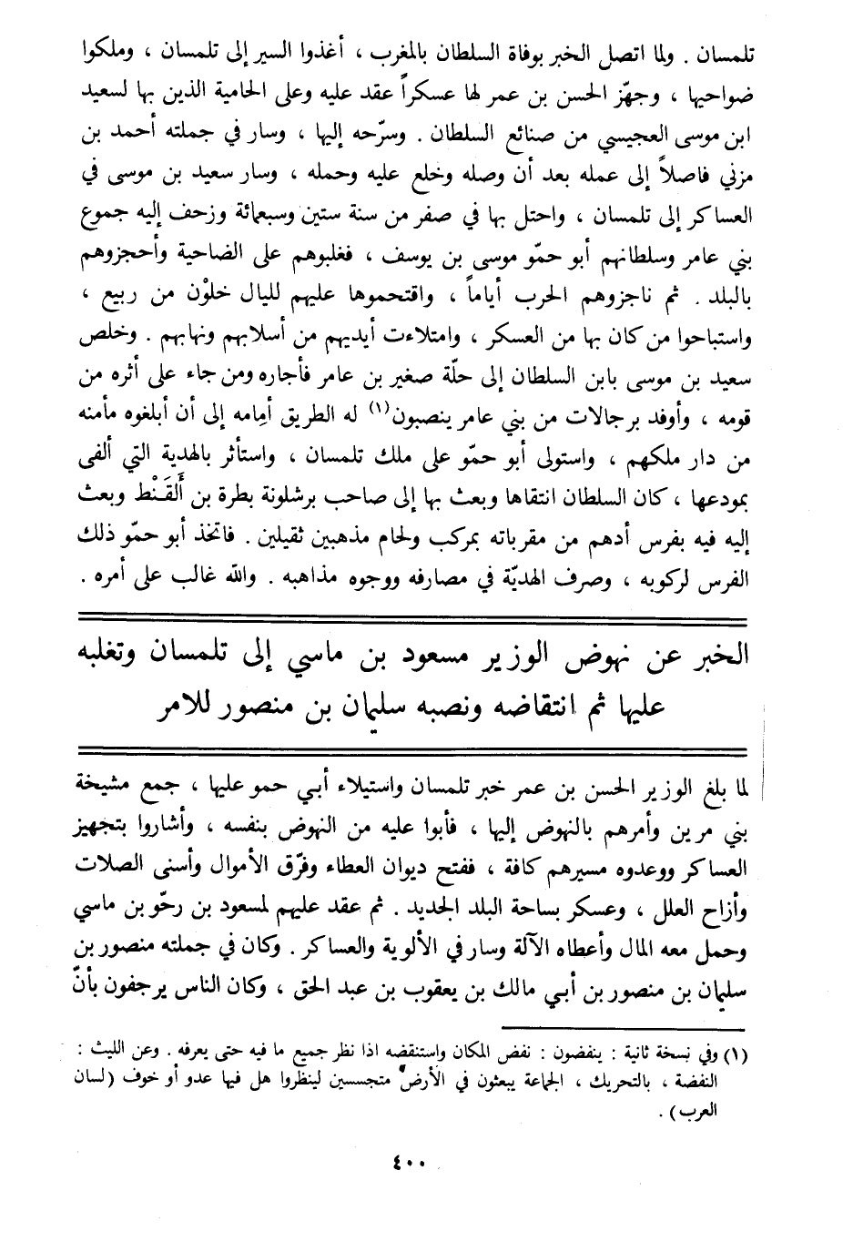 تلمسان. ولما اتصل الخبر بوفاة السلطان بالمغرب، أغذّوا السير إلى تلمسان، وملكوا ضواحيها، وجهّز الحسن بن عمر لها عسكرا عقد عليه وعلى الحامية الذين بها لسعيد ابن موسى العجيسي من صنائع السلطان. وسرّحه إليها، وسار في جملته أحمد بن مزني فاصلا إلى عمله بعد أن وصله وخلع عليه وحمله، وسار سعيد بن موسى في العساكر إلى تلمسان، واحتل بها في صفر من سنة ستين وسبعمائة وزحف إليه جموع بني عامر وسلطانهم أبو حمّو موسى بن يوسف، فغلبوهم على الضاحية وأحجزوهم بالبلد. ثم ناجزوهم الحرب أياما، واقتحموها عليهم لليال خلون من ربيع، واستباحوا من كان بها من العسكر، وامتلأت أيديهم من أسلابهم ونهابهم. وخلص سعيد بن موسى بابن السلطان إلى حلّة صغير بن عامر فأجاره ومن جاء على أثره من قومه، وأوفد برجالات من بني عامر ينصبون [1] له الطريق أمامه إلى أن أبلغوه مأمنه من دار ملكهم، واستولى أبو حمّو على ملك تلمسان، واستأثر بالهدية التي ألفى بمودعها، كان السلطان انتقاها وبعث بها إلى صاحب برشلونة بطرة بن ألقنط وبعث إليه فيه بفرس أدهم من مقرباته بمركب ولحام مذهبين ثقيلين. فاتخذ أبو حمّو ذلك الفرس لركوبه، وصرف الهديّة في مصارفه ووجوه مذاهبه. والله غالب على أمره.