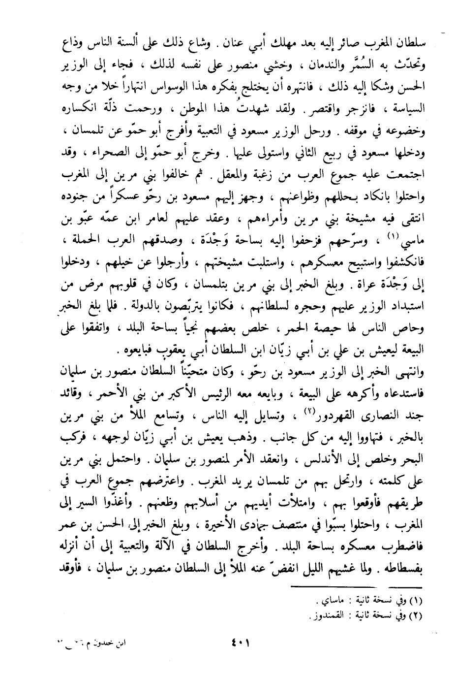 سلطان المغرب صائر إليه بعد مهلك أبي عنان. وشاع ذلك على ألسنة الناس وذاع وتحدّث به السمّر والندمان، وخشي منصور على نفسه لذلك، فجاء إلى الوزير الحسن وشكا إليه ذلك، فانتهره أن يختلج بفكره هذا الوسواس انتهارا خلا من وجه السياسة، فانزجر واقتصر. ولقد شهدت هذا الموطن، ورحمت ذلّة انكساره وخضوعه في موقفه. ورحل الوزير مسعود في التعبية وأفرج أبو حمّو عن تلمسان، ودخلها مسعود في ربيع الثاني واستولى عليها. وخرج أبو حمّو إلى الصحراء، وقد اجتمعت عليه جموع العرب من زغبة والمعقل. ثم خالفوا بني مرين إلى المغرب واحتلوا بانكاد بحللهم وظواعنهم، وجهز إليهم مسعود بن رحّو عسكرا من جنوده انتقى فيه مشيخة بني مرين وأمراءهم، وعقد عليهم لعامر ابن عمّه عبّو بن ماسي [1] ، وسرّحهم فزحفوا إليه بساحة وجدة، وصدقهم العرب الحملة، فانكشفوا واستبيح معسكرهم، واستلبت مشيختهم، وأرجلوا عن خيلهم، ودخلوا إلى وجدة عراة. وبلغ الخبر إلى بني مرين بتلمسان، وكان في قلوبهم مرض من استبداد الوزير عليهم وحجره لسلطانهم، فكانوا يتربّصون بالدولة. فلما بلغ الخبر وحاص الناس لها حيصة الحمر، خلص بعضهم نجيا بساحة البلد، واتفقوا على البيعة ليعيش بن علي بن أبي زيّان ابن السلطان أبي يعقوب فبايعوه.