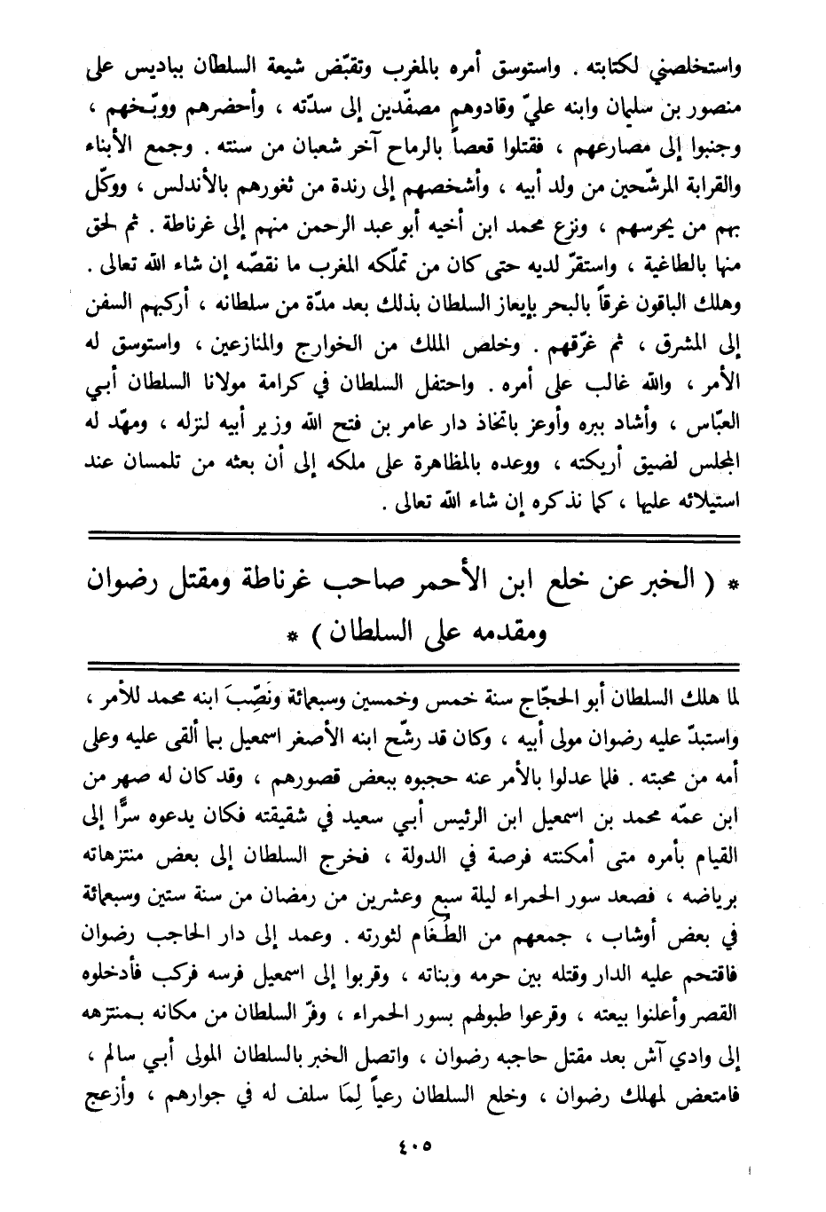 واستخلصني لكتابته. واستوسق أمره بالمغرب وتقبّض شيعة السلطان بباديس على منصور بن سليمان وابنه عليّ وقادوهم مصفّدين إلى سدّته، وأحضرهم ووبّخهم، وجنبوا إلى مصارعهم، فقتلوا قعصا بالرماح آخر شعبان من سنته. وجمع الأبناء والقرابة المرشّحين من ولد أبيه، وأشخصهم إلى رندة من ثغورهم بالأندلس، ووكّل بهم من يحرسهم، ونزع محمد ابن أخيه أبو عبد الرحمن منهم إلى غرناطة. ثم لحق منها بالطاغية، واستقرّ لديه حتى كان من تملّكه المغرب ما نقصّه إن شاء الله تعالى.