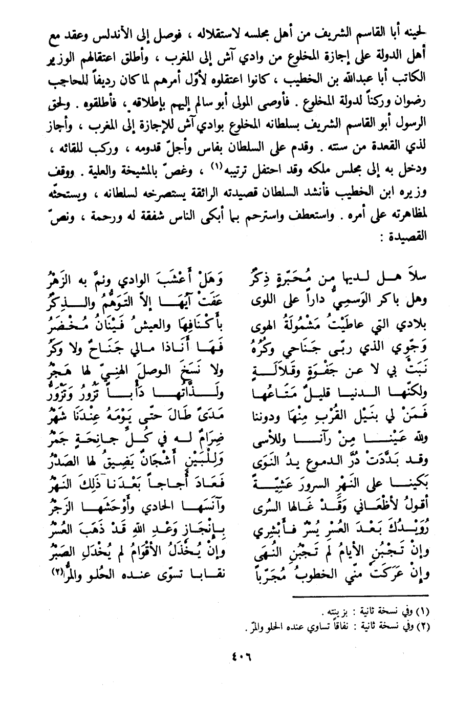 لحينه أبا القاسم الشريف من أهل مجلسه لاستقلاله، فوصل إلى الأندلس وعقد مع أهل الدولة على إجازة المخلوع من وادي آش إلى المغرب، وأطلق اعتقالهم الوزير الكاتب أبا عبد الله بن الخطيب، كانوا اعتقلوه لأوّل أمرهم لما كان رديفا للحاجب رضوان وركنا لدولة المخلوع. فأوصى المولى أبو سالم إليهم بإطلاقه، فأطلقوه. ولحق الرسول أبو القاسم الشريف بسلطانه المخلوع بوادي آش للإجازة إلى المغرب، وأجاز لذي القعدة من سنته. وقدم على السلطان بفاس وأجلّ قدومه، وركب للقائه، ودخل به إلى مجلس ملكه وقد احتفل ترتيبه [1] ، وغصّ بالمشيخة والعلية. ووقف وزيره ابن الخطيب فأنشد السلطان قصيدته الرائقة يستصرخه لسلطانه، ويستحثّه لمظاهرته على أمره. واستعطف واسترحم بما أبكى الناس شفقة له ورحمة، ونصّ القصيدة: