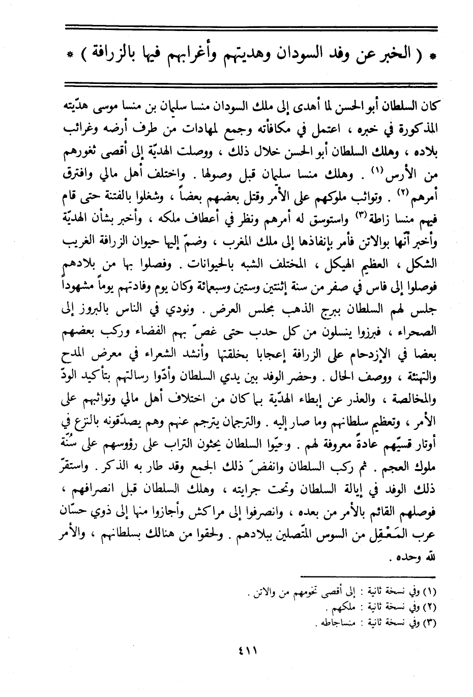 كان السلطان أبو الحسن لما أهدى إلى ملك السودان منسا سليمان بن منسا موسى هديّته المذكورة في خبره، اعتمل في مكافأته وجمع لمهادات من طرف أرضه وغرائب بلاده، وهلك السلطان أبو الحسن خلال ذلك، ووصلت الهديّة إلى أقصى ثغورهم من الأرس [1] . وهلك منسا سليمان قبل وصولها. واختلف أهل مالي وافترق أمرهم [2] . وتواثب ملوكهم على الأمر وقتل بعضهم بعضا، وشغلوا بالفتنة حتى قام فيهم منسا زاطة [3] واستوسق له أمرهم ونظر في أعطاف ملكه، وأخبر بشأن الهديّة وأخبر أنّها بوالاتن فأمر بإنفاذها إلى ملك المغرب، وضمّ إليها حيوان الزرافة الغريب الشكل، العظيم الهيكل، المختلف الشبه بالحيوانات. وفصلوا بها من بلادهم فوصلوا إلى فاس في صفر من سنة اثنتين وستين وسبعمائة وكان يوم وفادتهم يوما مشهودا جلس لهم السلطان ببرج الذهب مجلس العرض. ونودي في الناس بالبروز إلى الصحراء، فبرزوا ينسلون من كل حدب حتى غصّ بهم الفضاء وركب بعضهم بعضا في الازدحام على الزرافة إعجابا بخلقتها وأنشد الشعراء في معرض المدح والتهنئة، ووصف الحال. وحضر الوفد بين يدي السلطان وأدّوا رسالتهم بتأكيد الودّ والمخالصة، والعذر عن إبطاء الهديّة بما كان من اختلاف أهل مالي وتواثبهم على الأمر، وتعظيم سلطانهم وما صار إليه. والترجمان يترجم عنهم وهم يصدّقونه بالنزع في أوتار قسيّهم عادة معروفة لهم. وحيّوا السلطان يحثون التراب على رءوسهم على سنّة ملوك العجم. ثم ركب السلطان وانفضّ ذلك الجمع وقد طار به الذكر. واستقرّ ذلك الوفد في إيالة السلطان وتحت جرايته، وهلك السلطان قبل انصرافهم، فوصلهم القائم بالأمر من بعده، وانصرفوا إلى مراكش وأجازوا منها إلى ذوي حسّان عرب المعقل من السوس المتّصلين ببلادهم. ولحقوا من هنالك بسلطانهم، والأمر للَّه وحده.