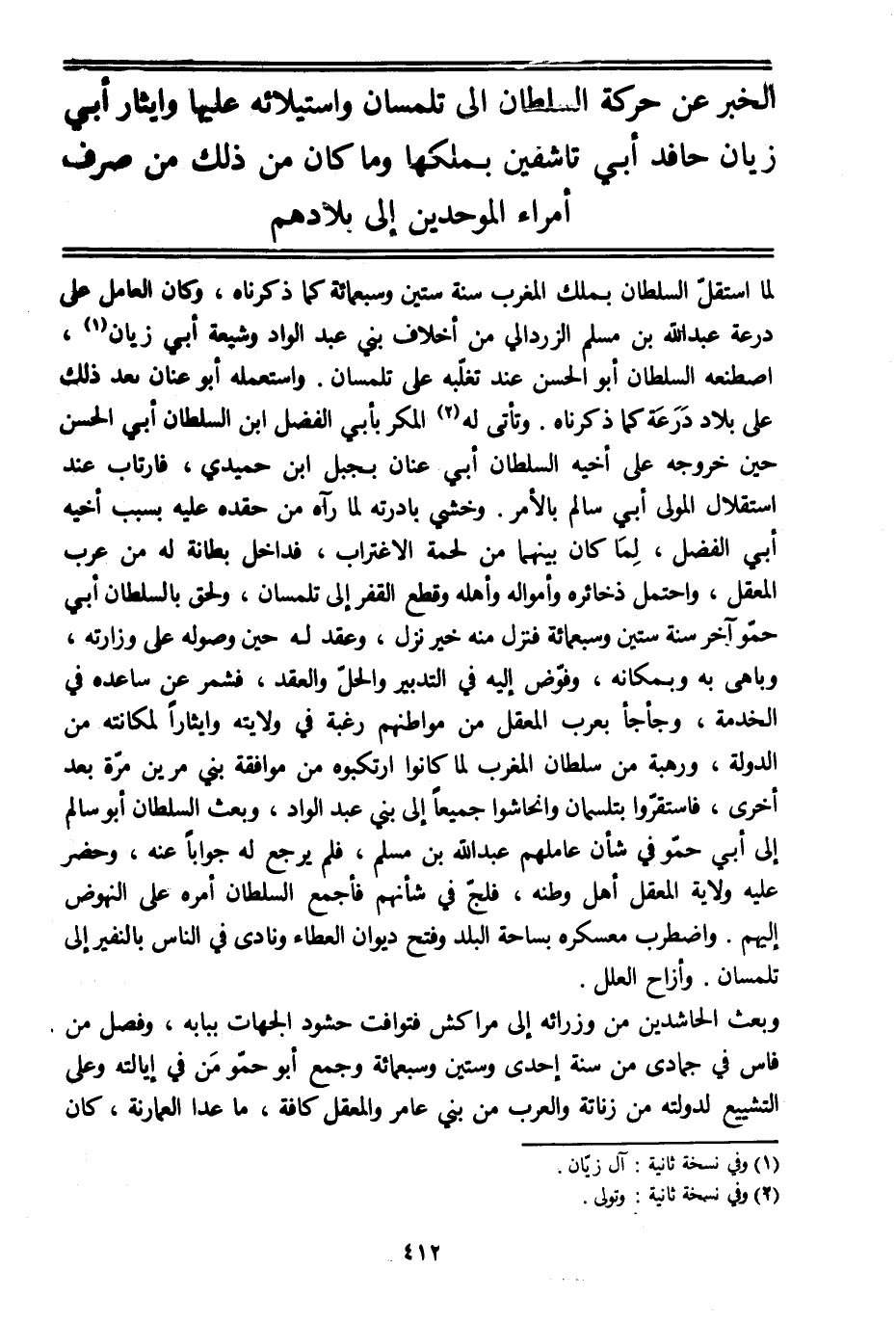 الخبر عن حركة السلطان الى تلمسان واستيلائه عليها وإيثار أبي زيان حافد أبي تاشفين بملكها وما كان من ذلك من صرف أمراء الموحدين إلى بلادهم